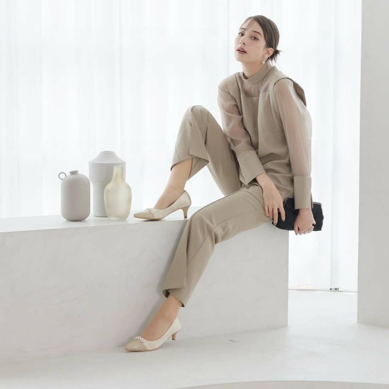 ・光沢のあるサテンとグリッターヒールで後ろ姿まで隙のない素敵コーデに。