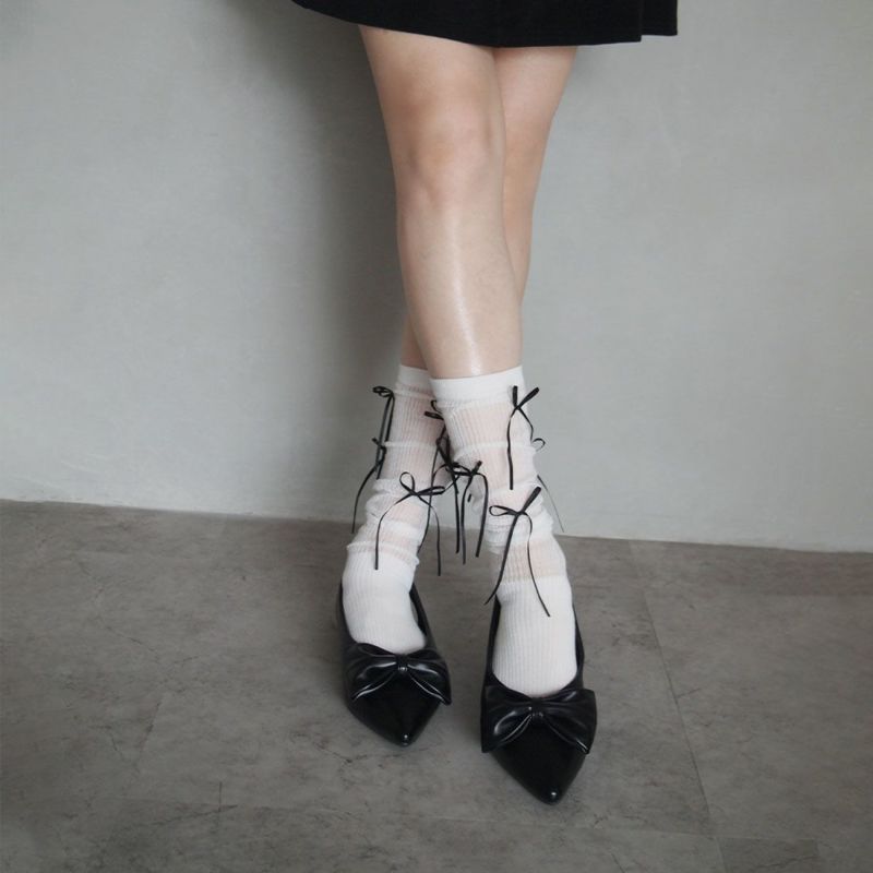 ・韓国トレンドの長めなサテンリボンがポイントのハイソックス!