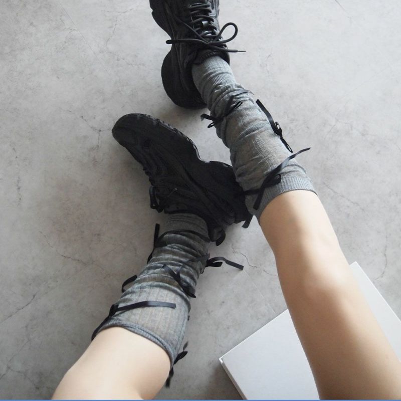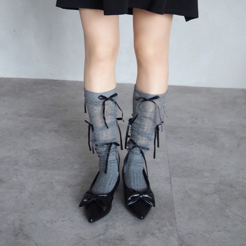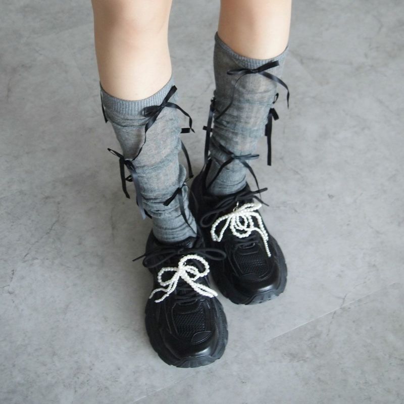 ・韓国トレンドの長めなサテンリボンがポイントのニーハイソックス!