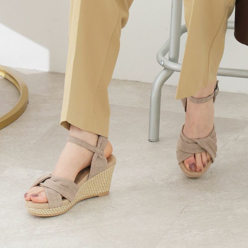 ・柔らかい布地のアッパーと、ラフィア素材のウェッジソールでナチュラルな印象に。