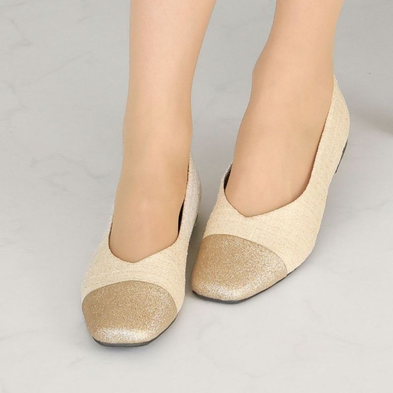 ・キラキラのグリッター×上品なラメ糸入りツイードがアクセサリー感覚で履ける!異素材の切り替えデザインがポイントのフラットパンプス!