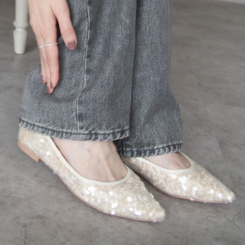 ・スパンコールの輝きをプラスした主役級キラキラフラットパンプス