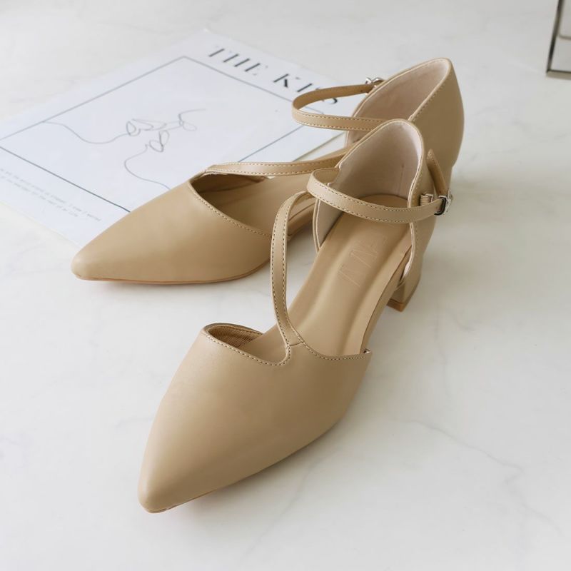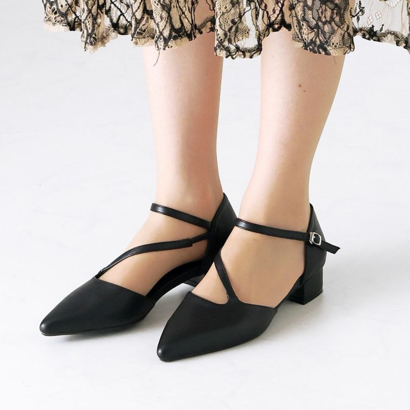 ・斜めストラップとセパレートデザインでレディライクな足元を演出