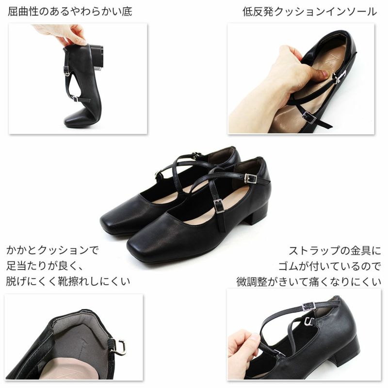・クロスストラップとコロンとしたソフトスクエアトゥでレディライクな足元を演出
