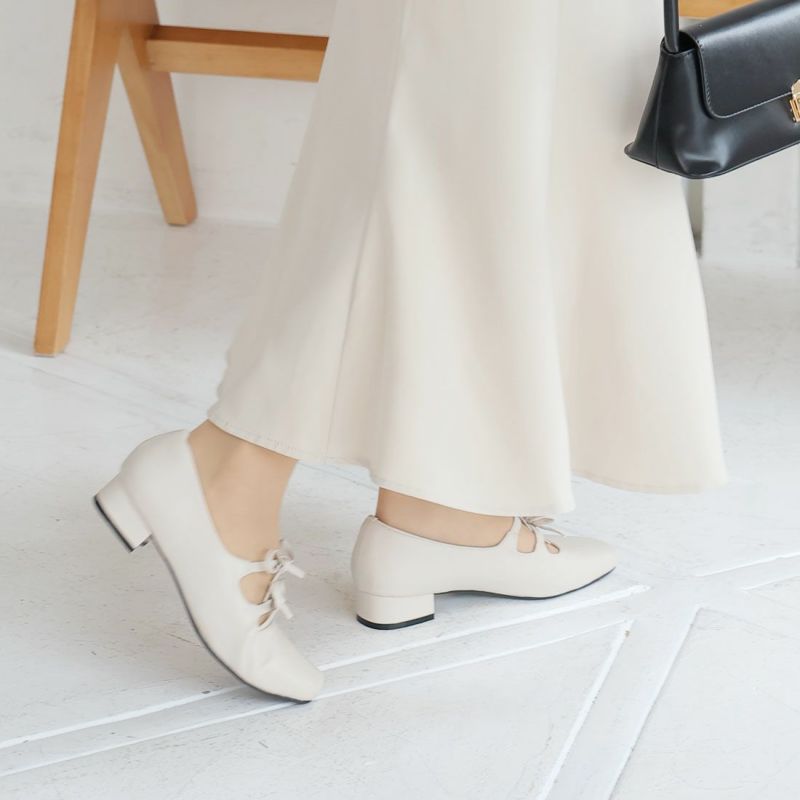 ・ダブルリボンとコロンとしたソフトスクエアトゥでレディライクな足元を演出