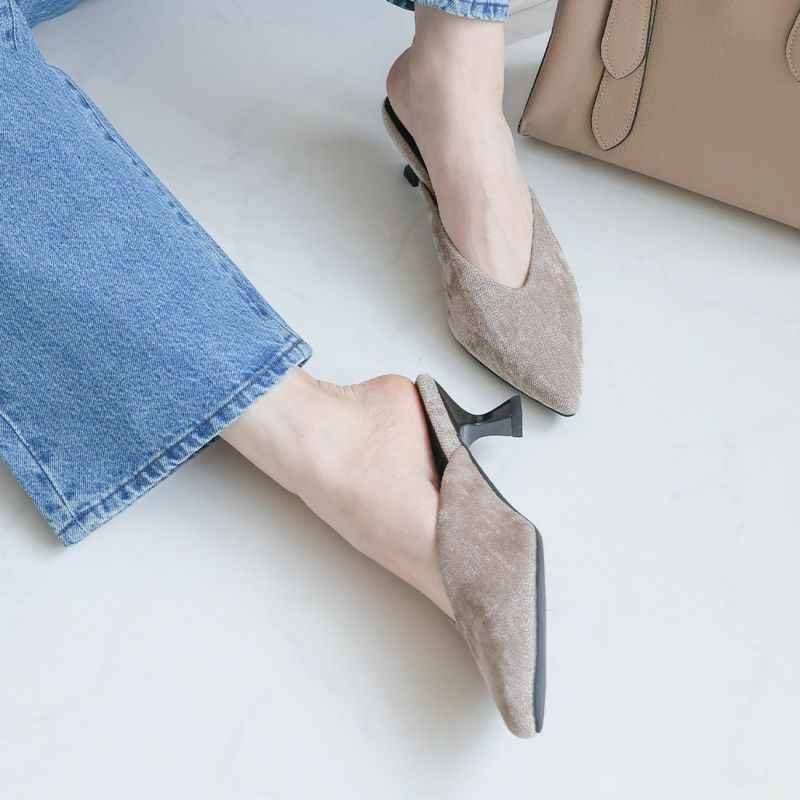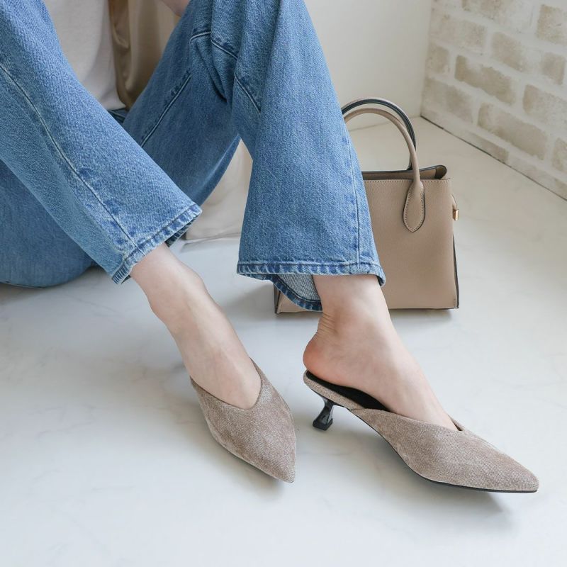 ・ポインテッドトゥ×艶のあるくびれ斜めヒールで甘くなりすぎない上品フォルム