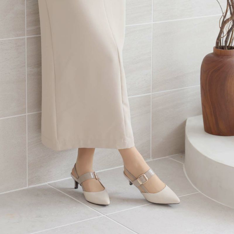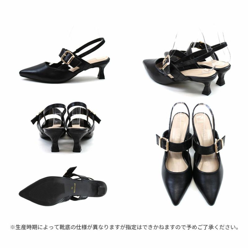 ・太ベルト×華奢バックストラップの対照的な組み合わせがモードでエレガントなパンプス。
