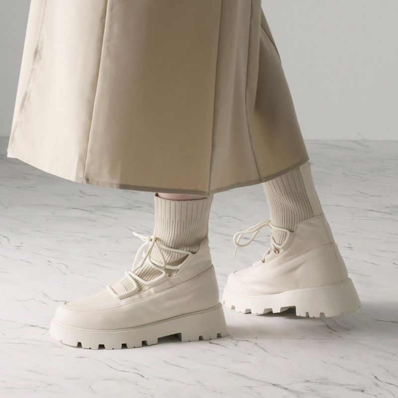 ・異素材をドッキングした個性的なデザインは、丸みのあるトゥとちょうどいい丈感で、スカートにもパンツにもバランス良く合わせやすく大人っぽいコーデに仕上がる。