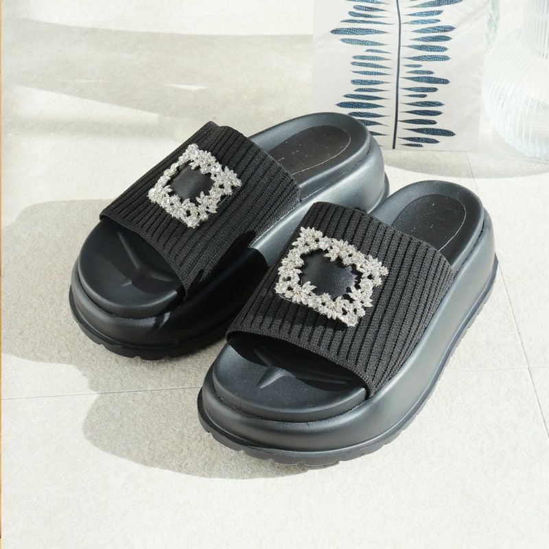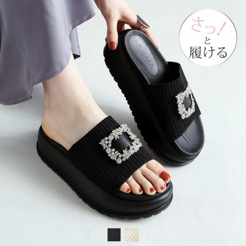 ・キラキラビジューバックルが輝くリブニットサンダル!