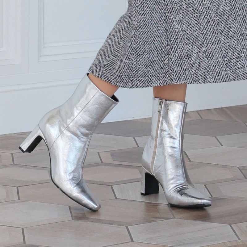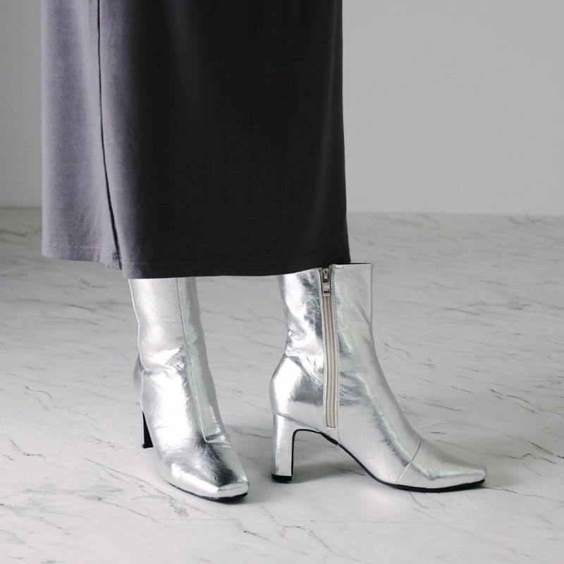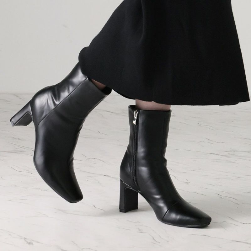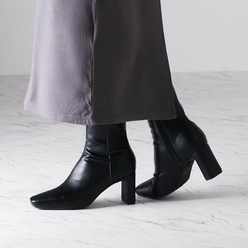 ・スクエアトゥ×プレートヒールでシャープさのある大人な美脚シルエットに。