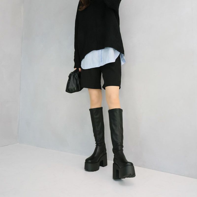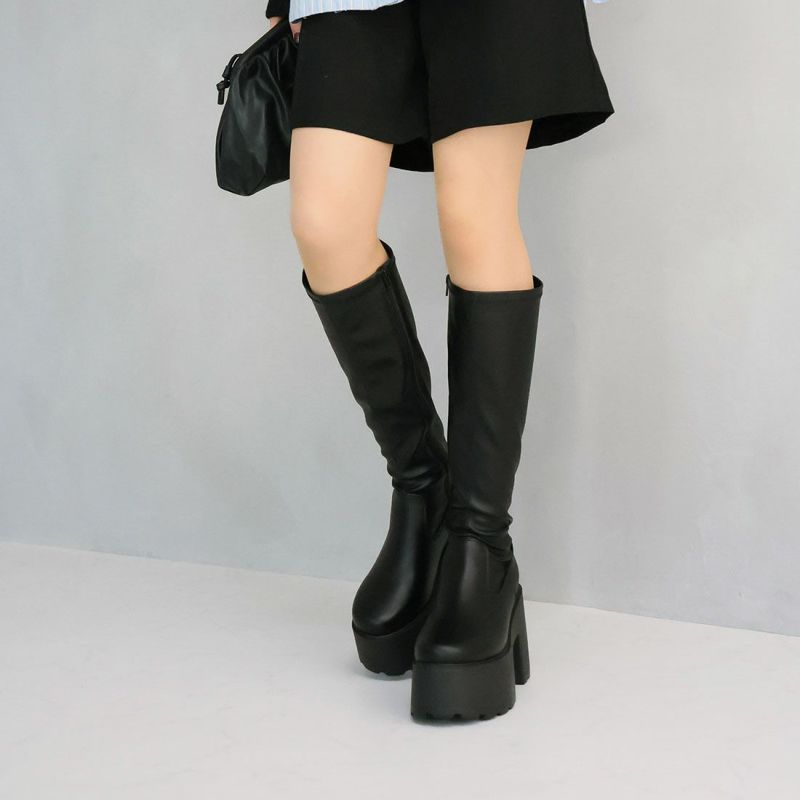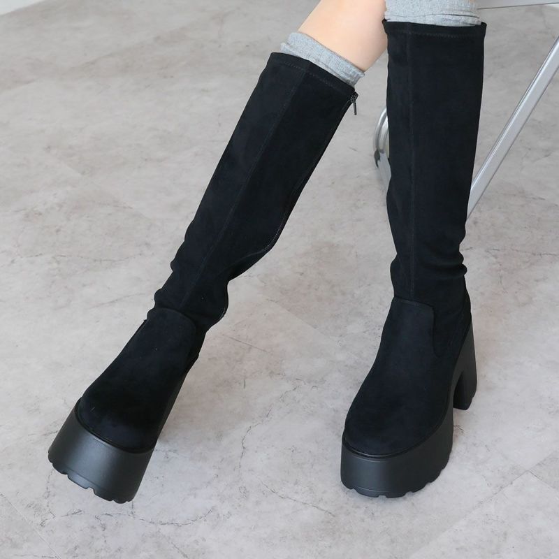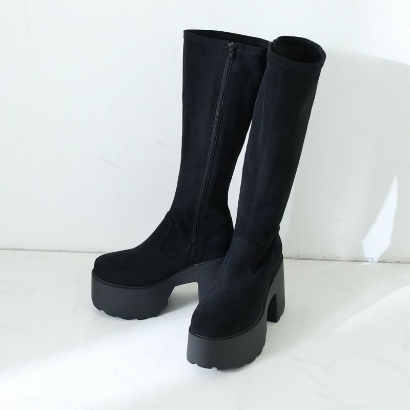 ・圧倒的な存在感を放つ11cmチャンキーヒールと、脚にフィットする美シルエットで足元も盛れるストレッチロングブーツ!