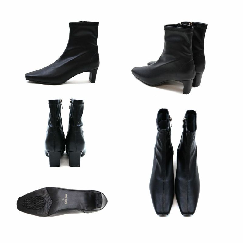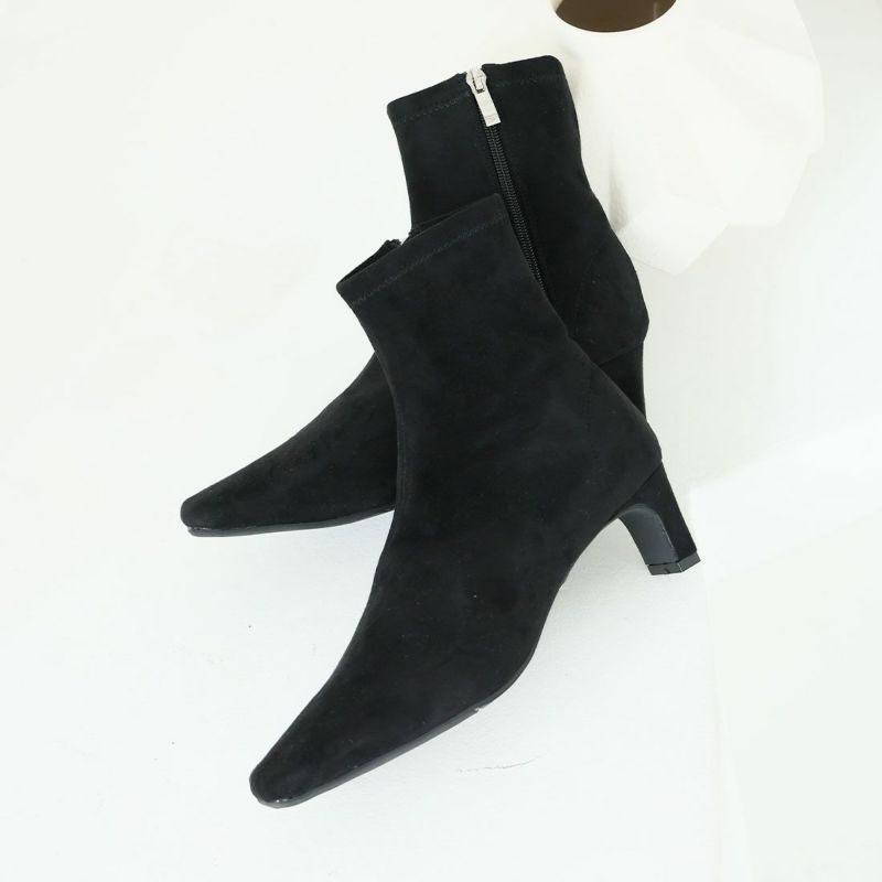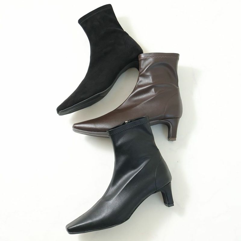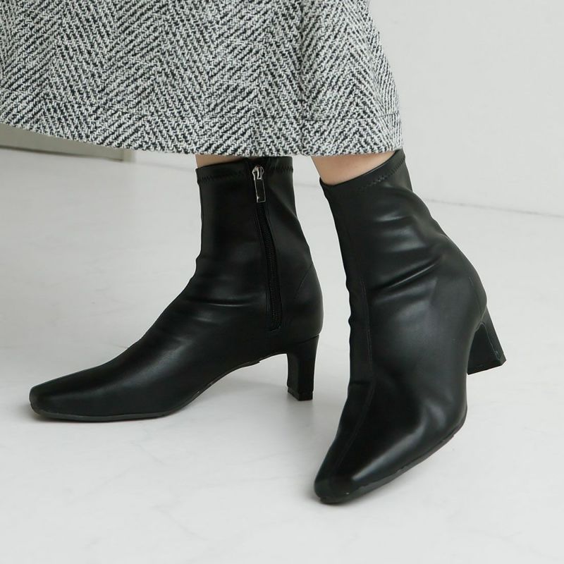 ・細めのスクエアトゥ×プレートヒールで脚をスッキリと見せてシャープさのある大人な美シルエットに。