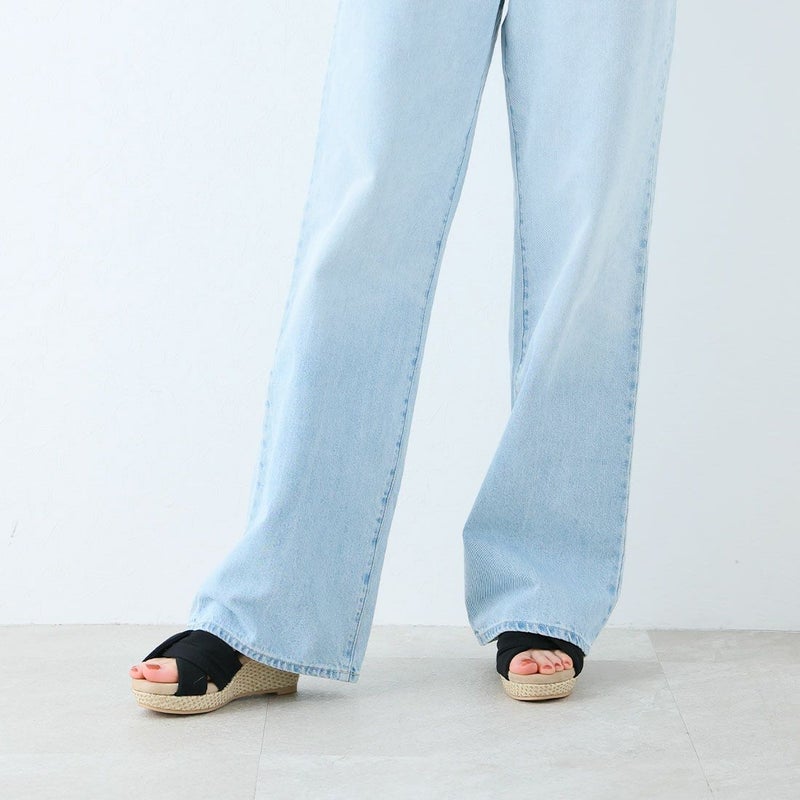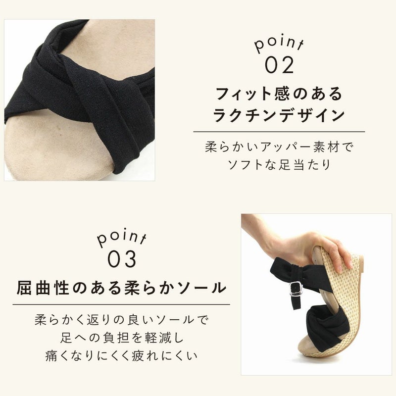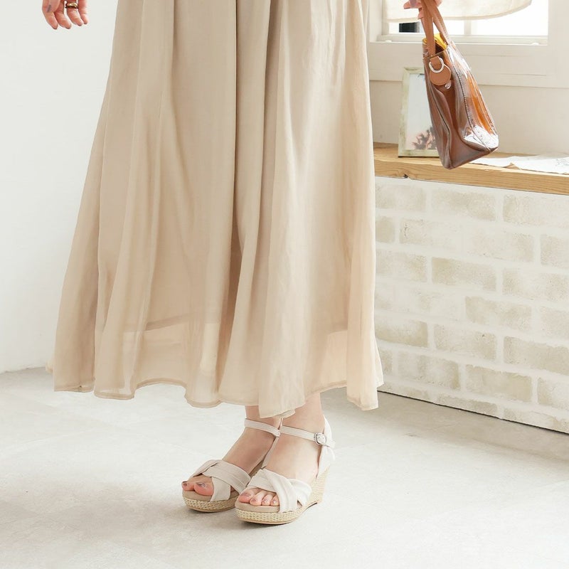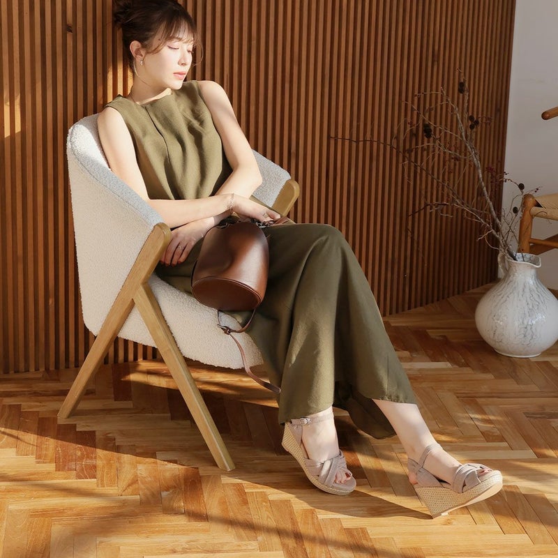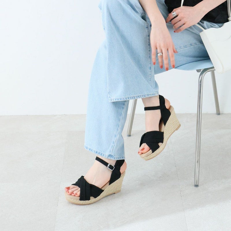 ・柔らかい布地のアッパーと、ラフィア素材のウェッジソールでナチュラルな印象に。