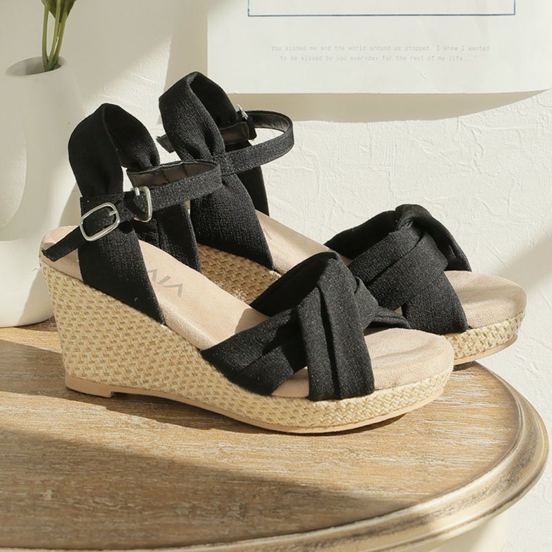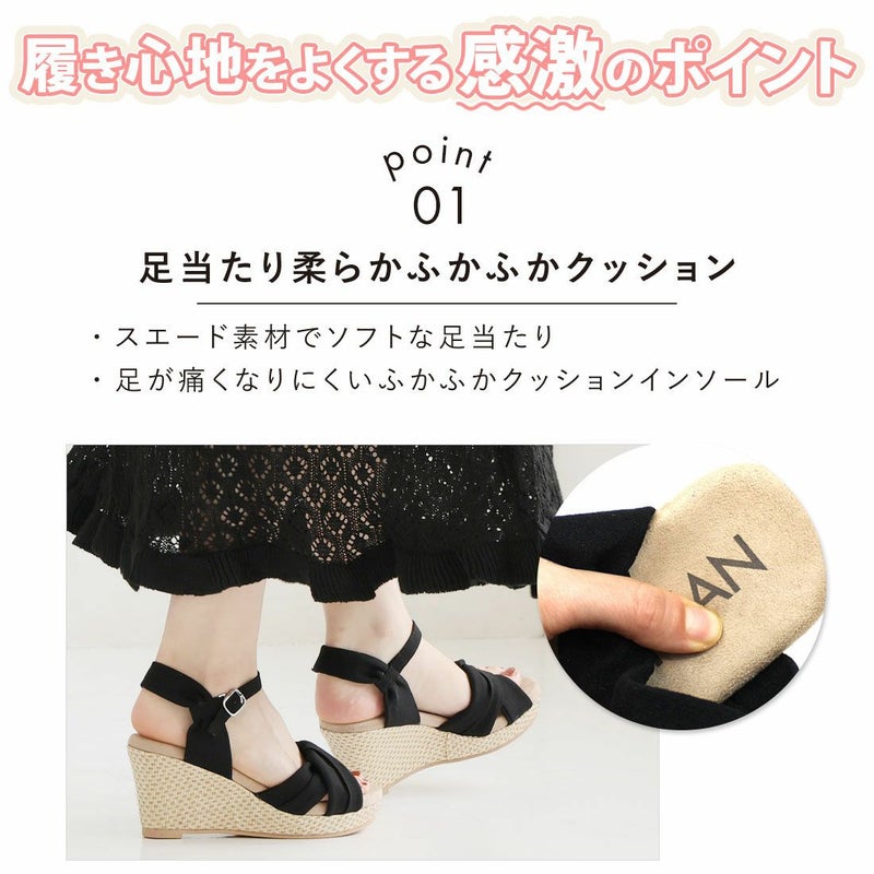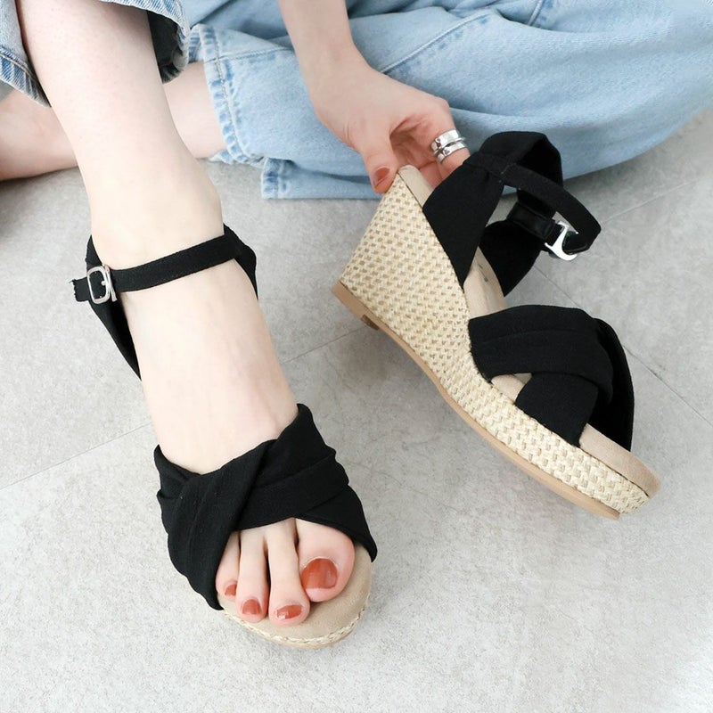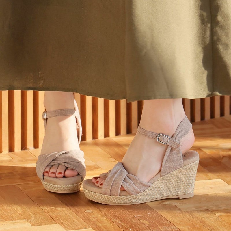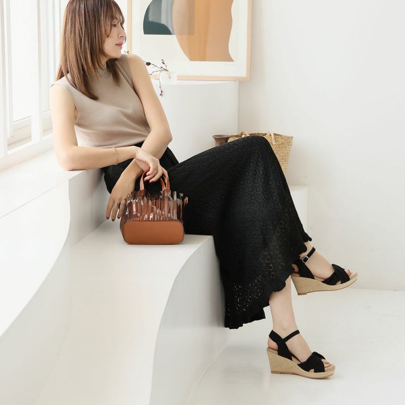 ・柔らかい布地のアッパーと、ラフィア素材のウェッジソールでナチュラルな印象に。
