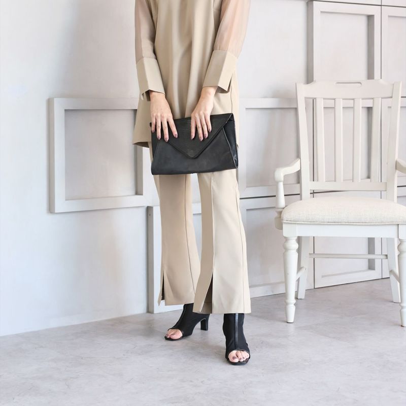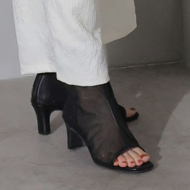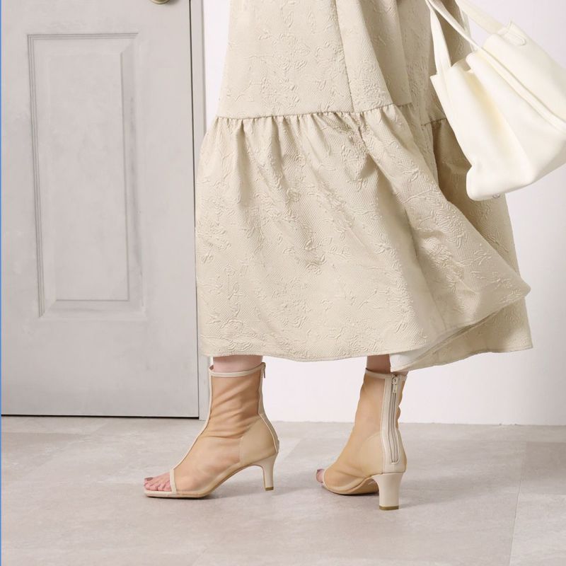 ・スクエアのオープントゥ×プレートヒールで甘くなりすぎない上品フォルム。