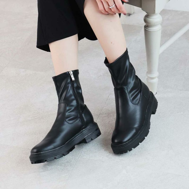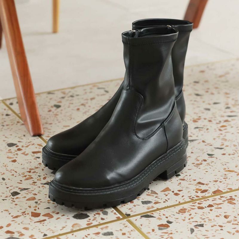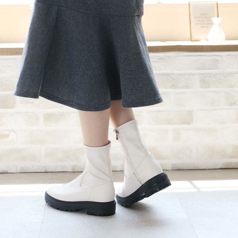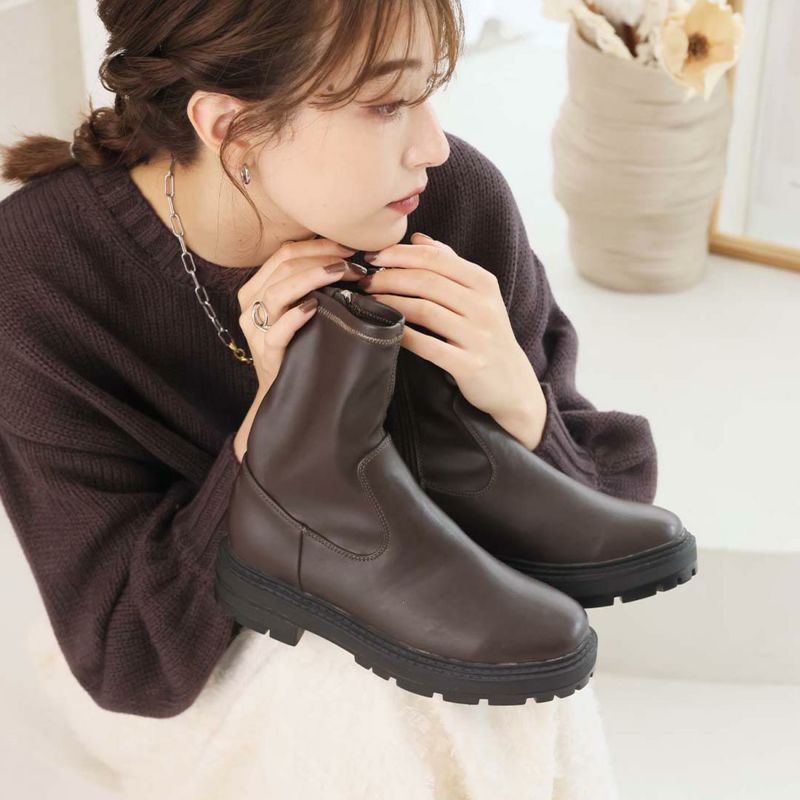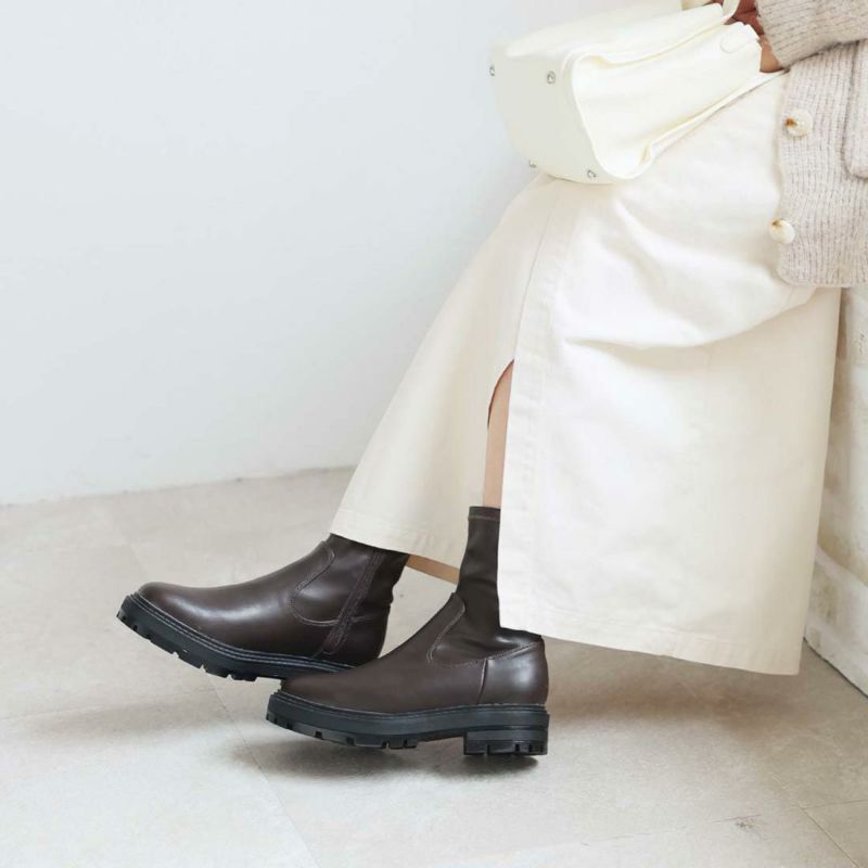 ・ゴツめデザインで足元にボリュームを持たせ、伸縮性のあるストレッチ素材が足にフィットし引き締まって見えるので、スタイルアップが期待できるアイテム。