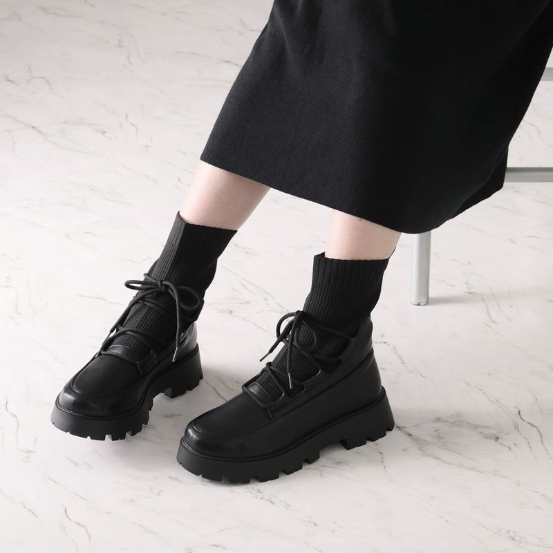 ・異素材をドッキングした個性的なデザインは、丸みのあるトゥとちょうどいい丈感で、スカートにもパンツにもバランス良く合わせやすく大人っぽいコーデに仕上がる。