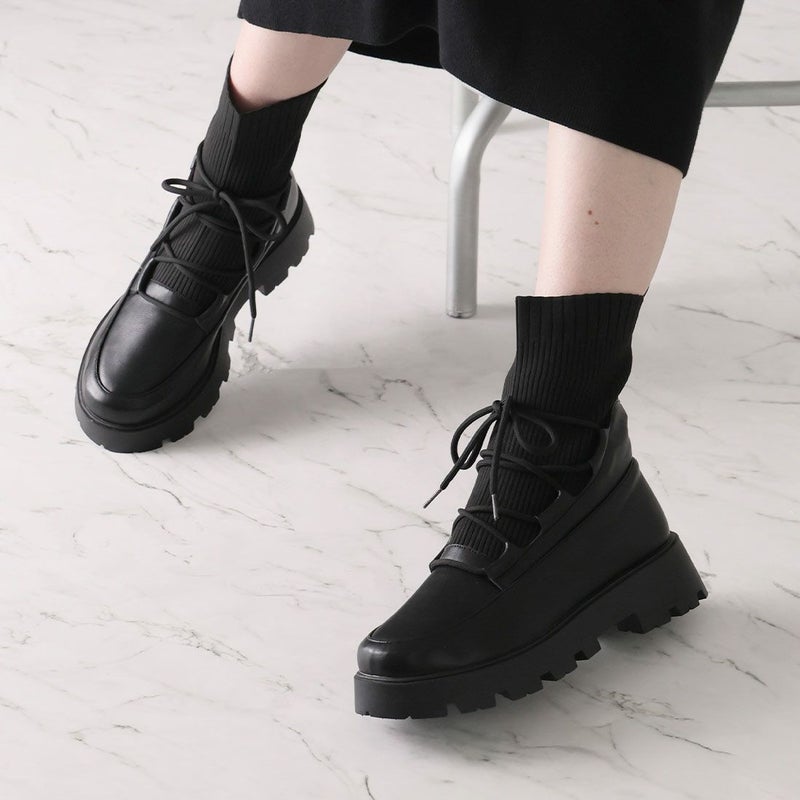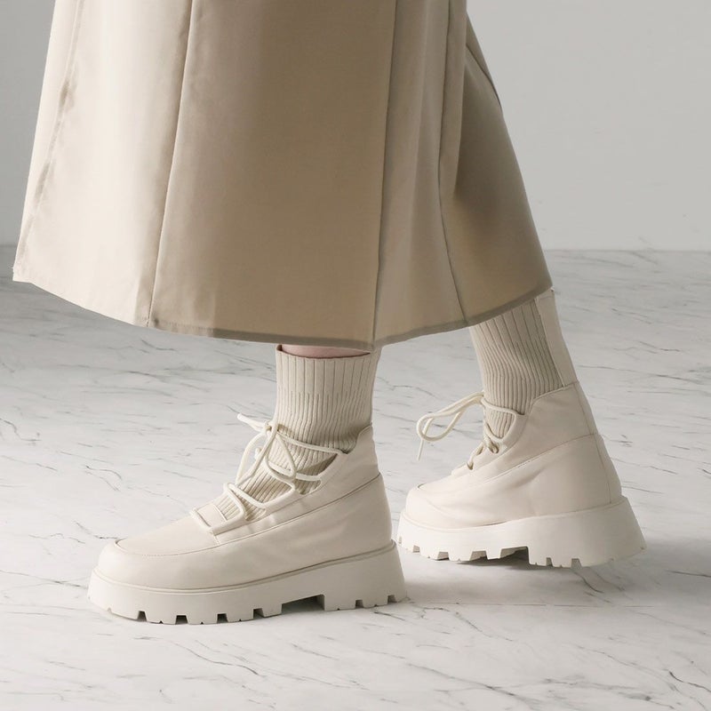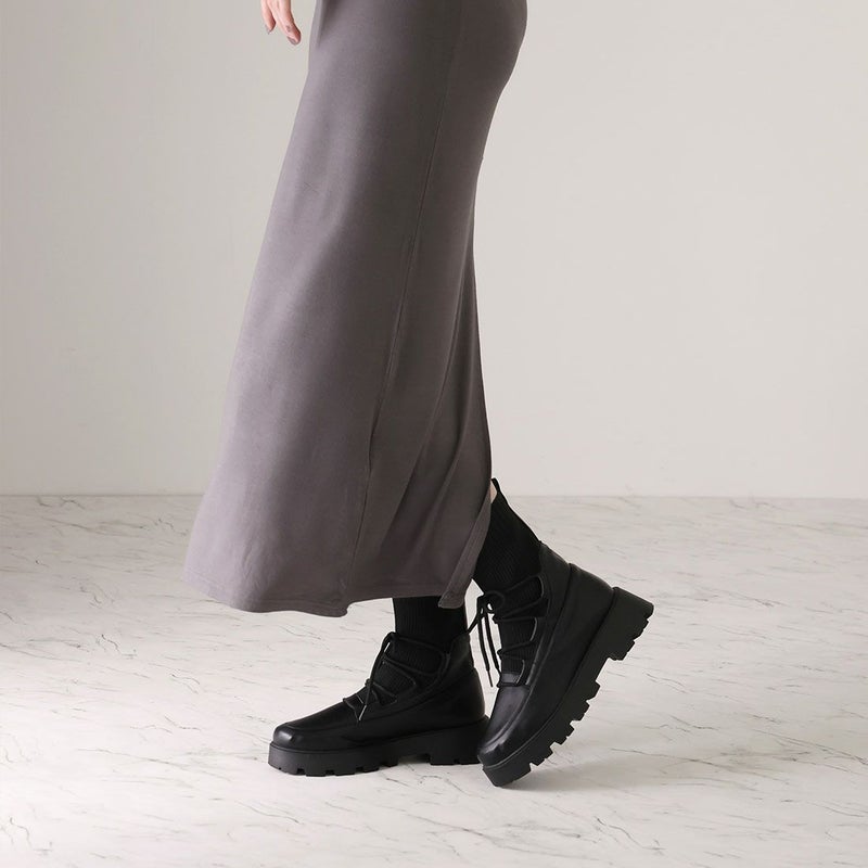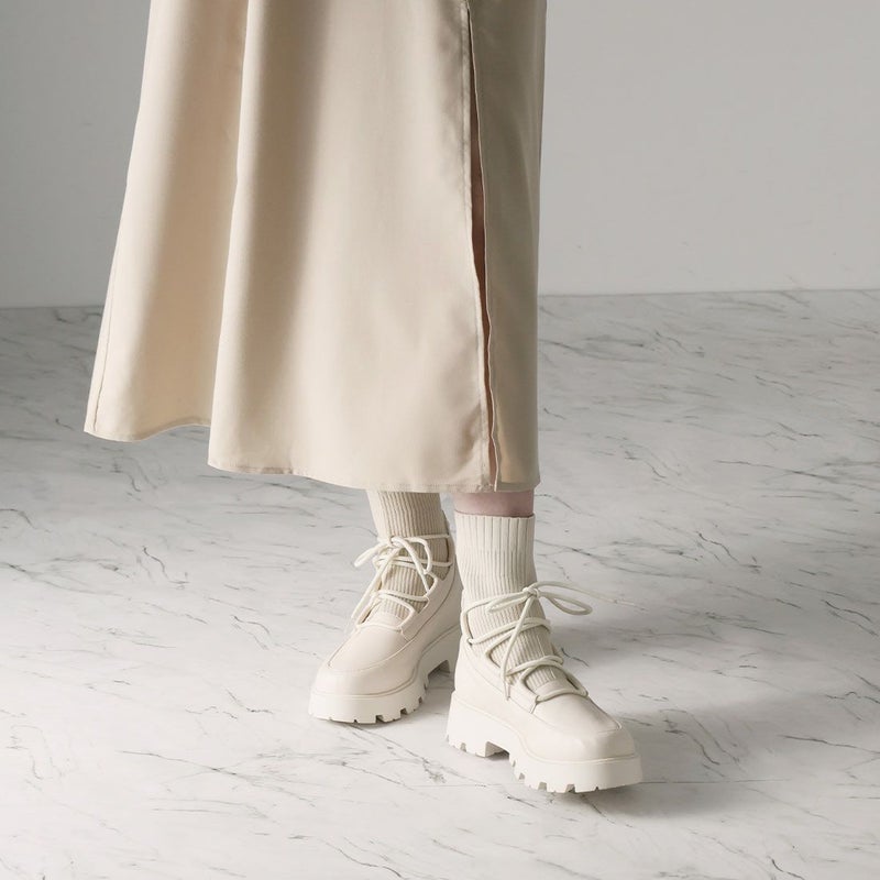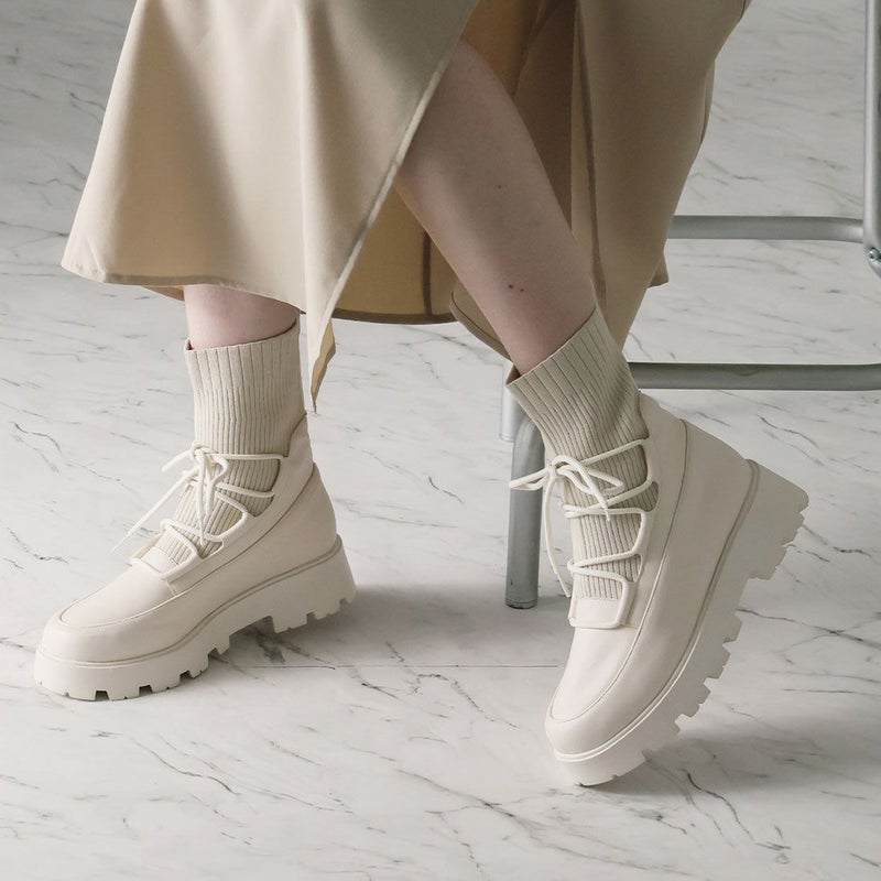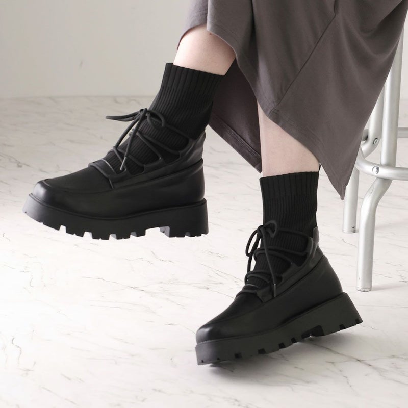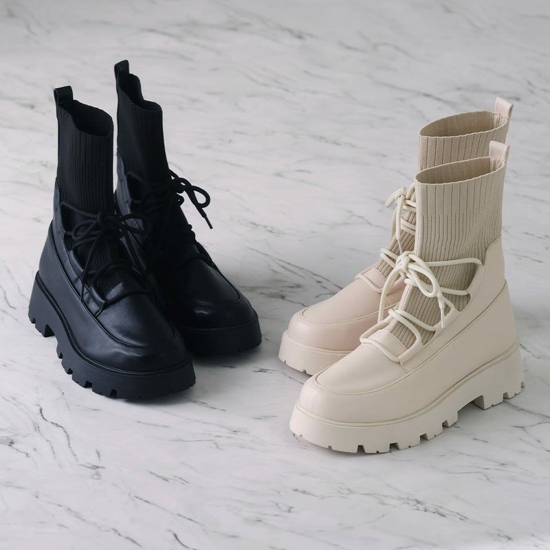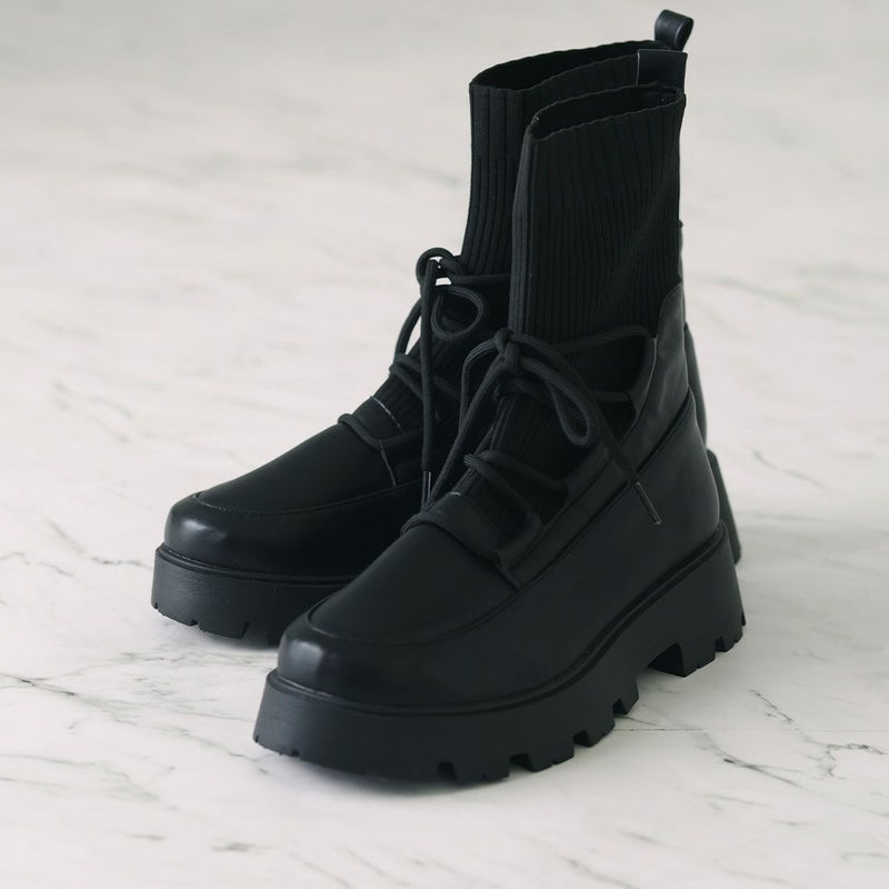 ・スムース素材にリブニットをドッキングしたゴツめレースアップニットブーツ