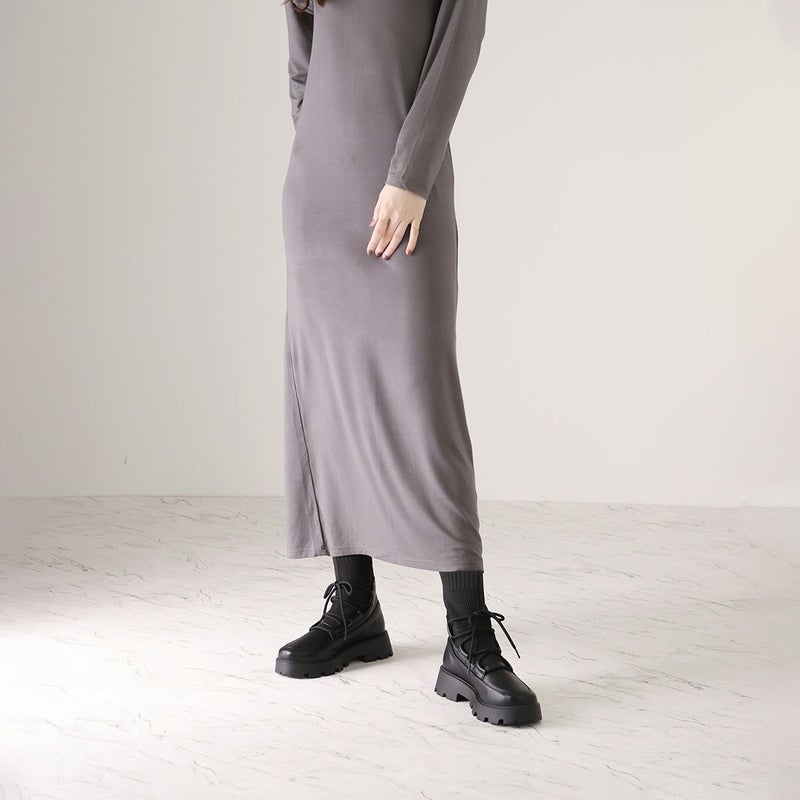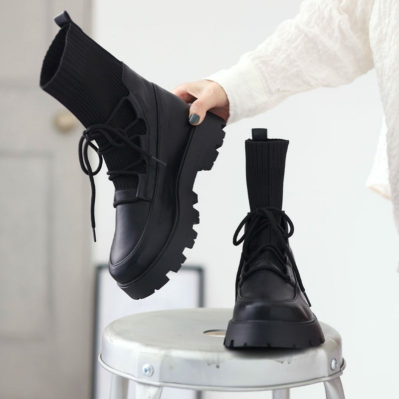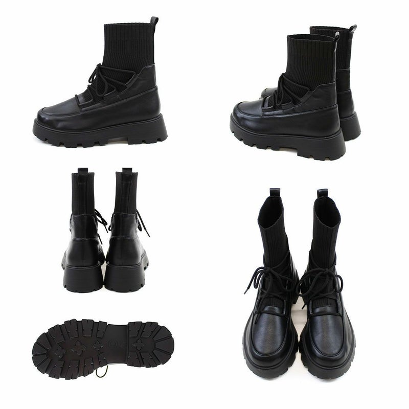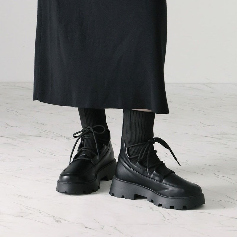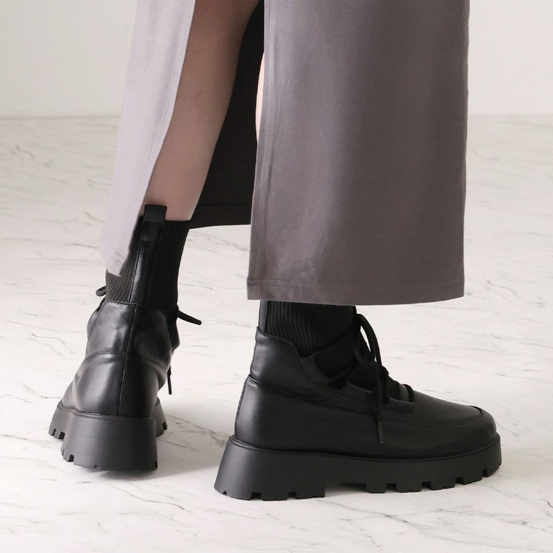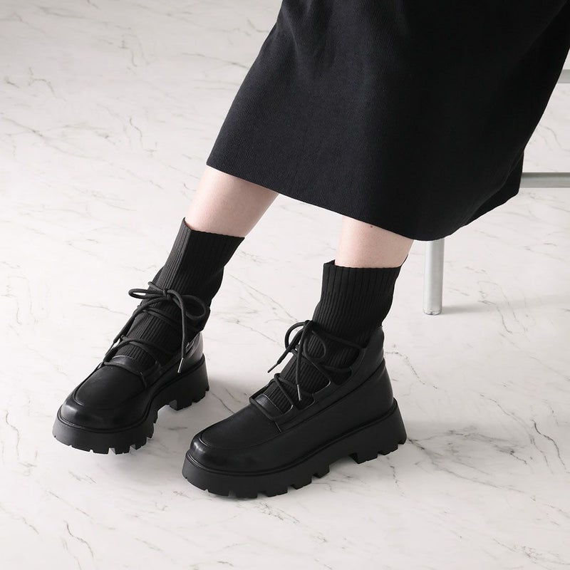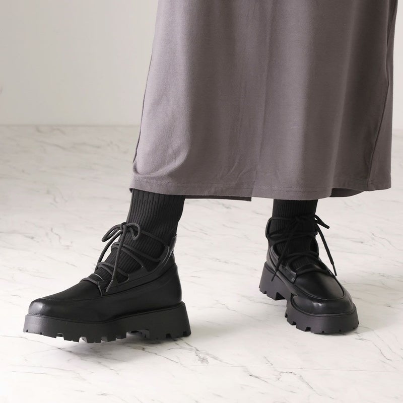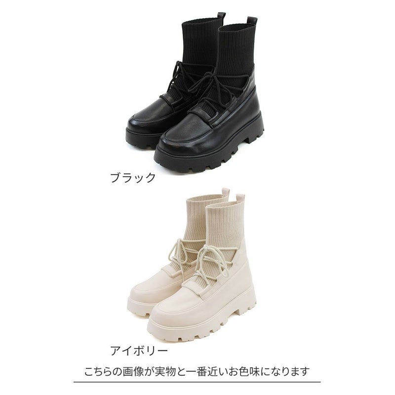 ・スムース素材にリブニットをドッキングしたゴツめレースアップニットブーツ