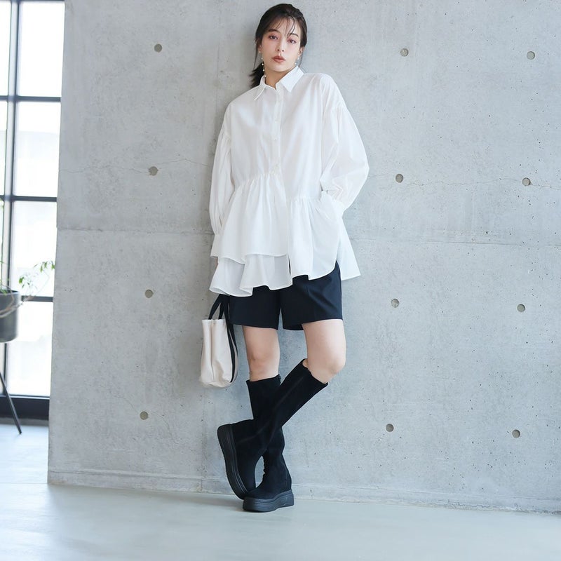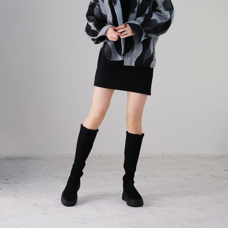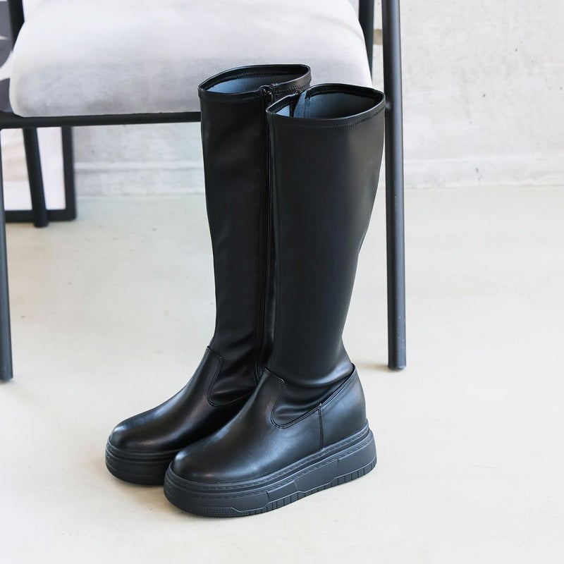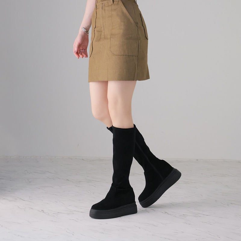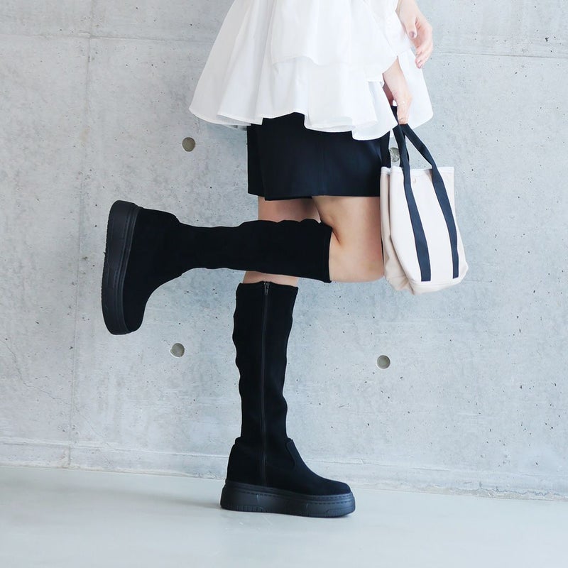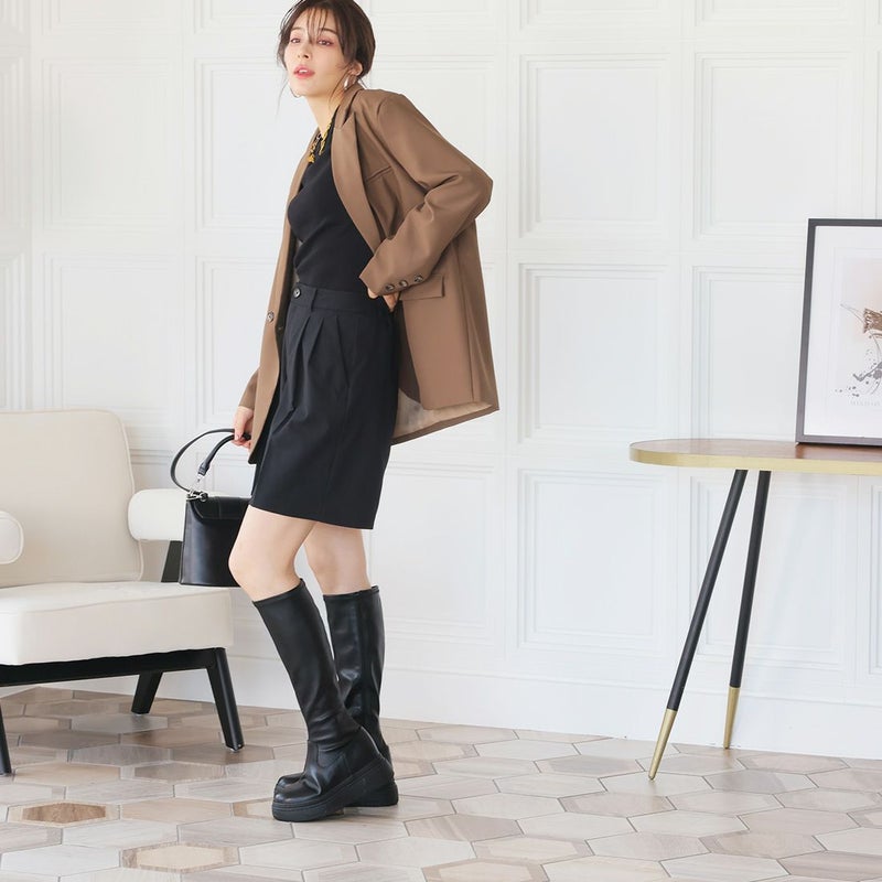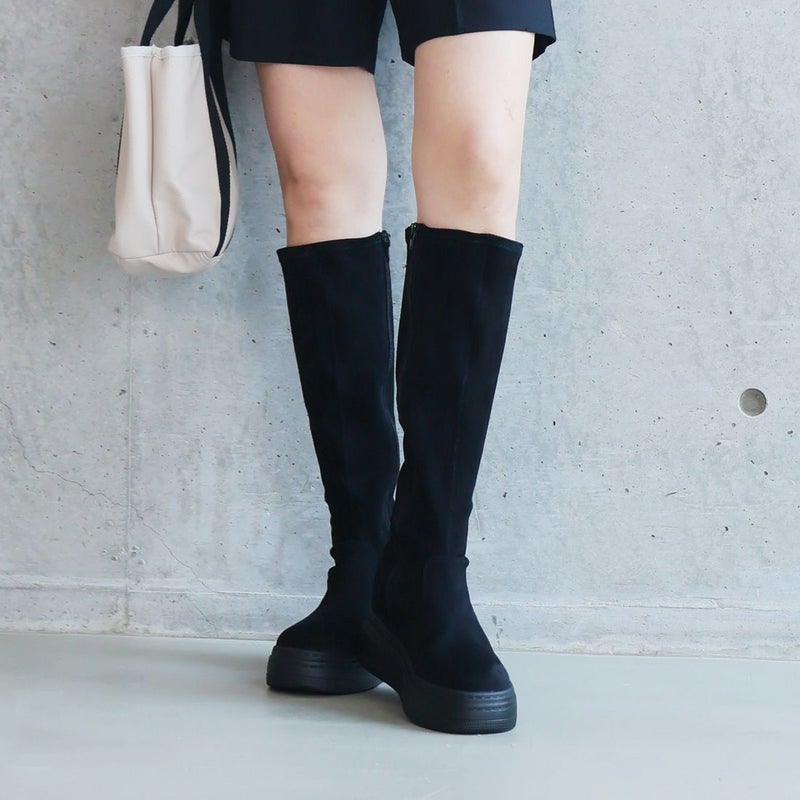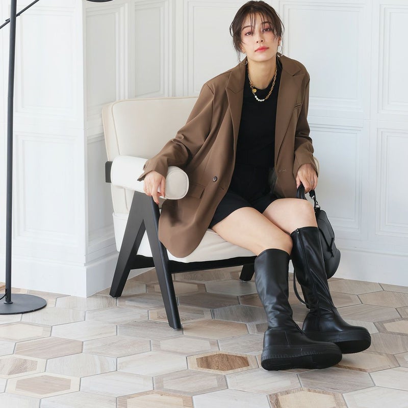 ・ゴツめデザインで足元にボリュームを持たせ、伸縮性のあるストレッチ素材が足にフィットし引き締まって見えるので、スタイルアップが期待できるアイテム。
