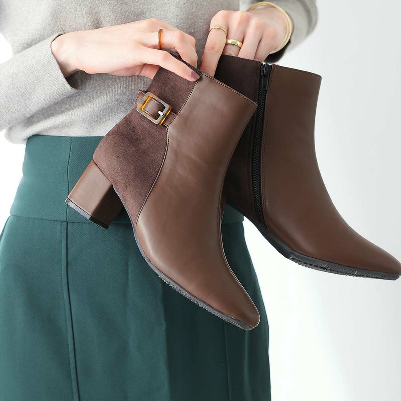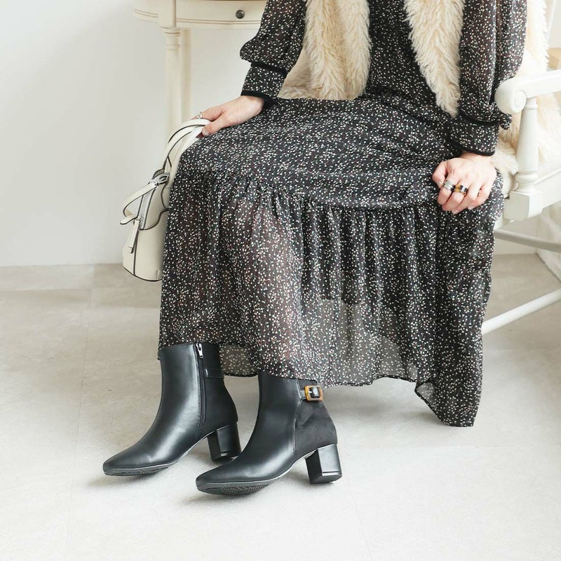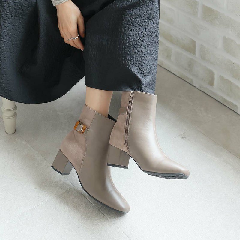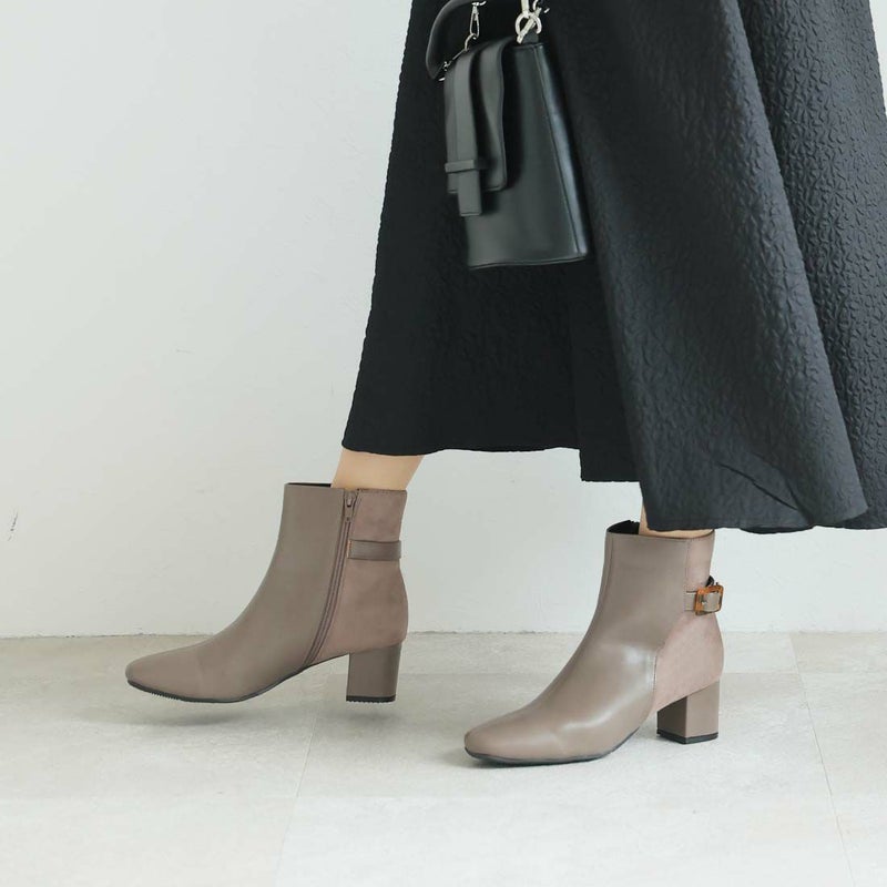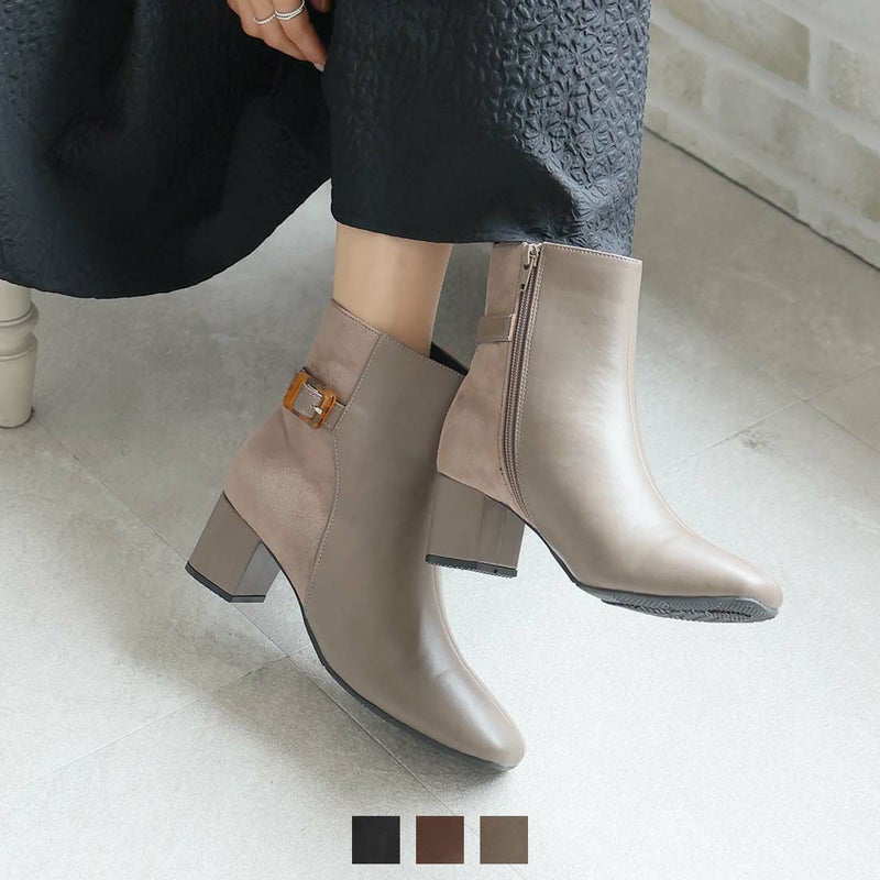 ・定番デザインもべっ甲調バックル付きベルトの異素材コンビでトラッド感漂うショートブーツに