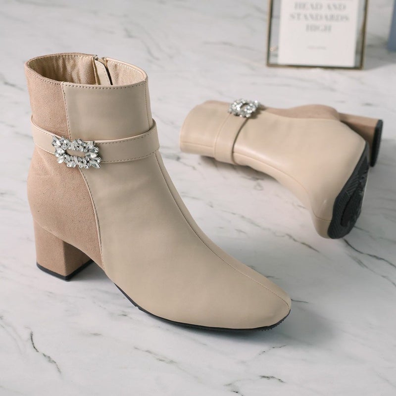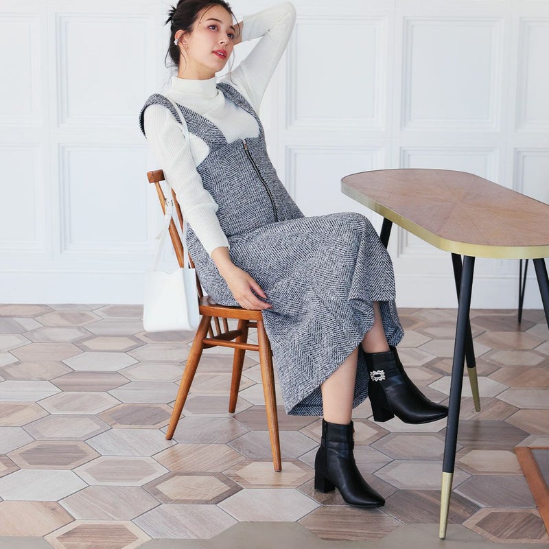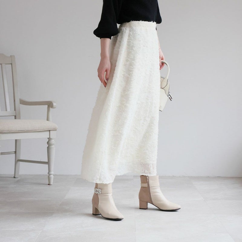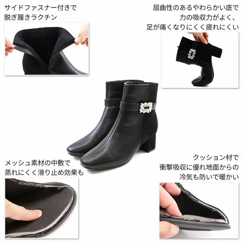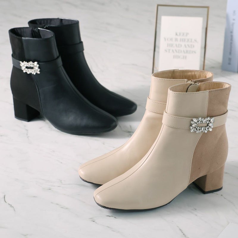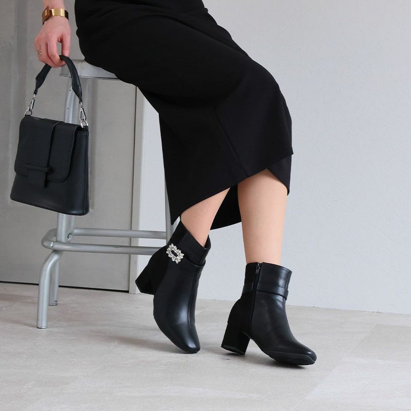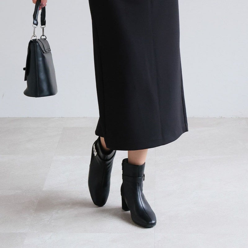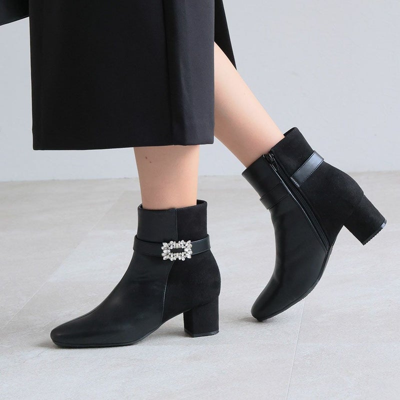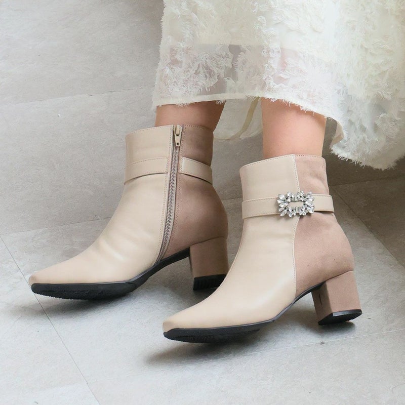 ・キラキラのビジューバックルと異素材コンビで大人っぽさ漂うショートブーツに