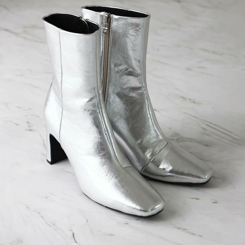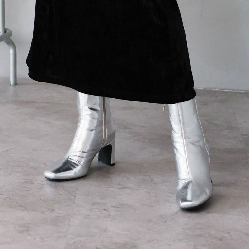 ・スクエアトゥ×プレートヒールでシャープさのある大人な美脚シルエットに。