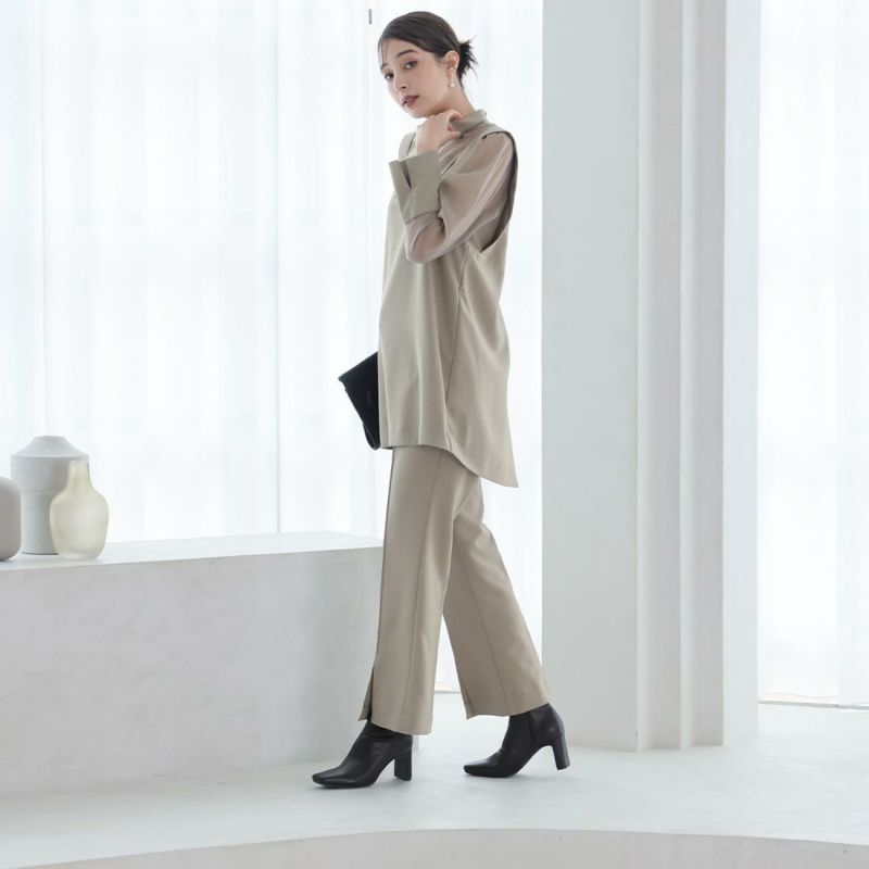 ・細めのスクエアトゥ×プレートヒールで脚をスッキリと見せてシャープさのある大人な美シルエットに。