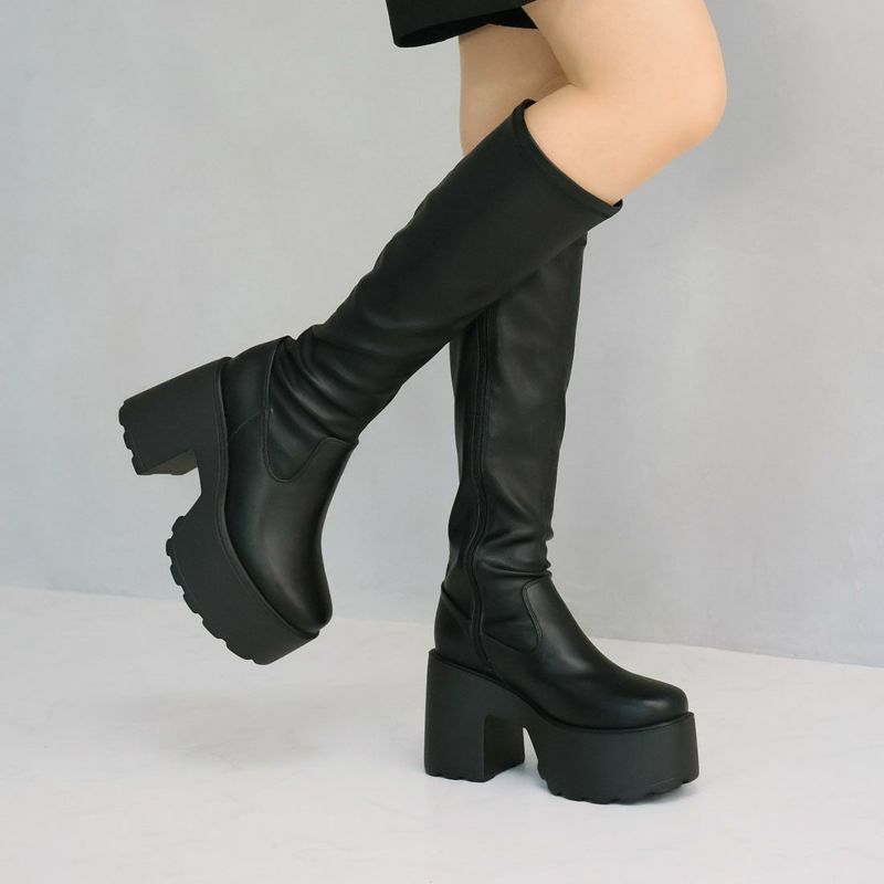 ・圧倒的な存在感を放つ11cmチャンキーヒールと、脚にフィットする美シルエットで足元も盛れるストレッチロングブーツ!