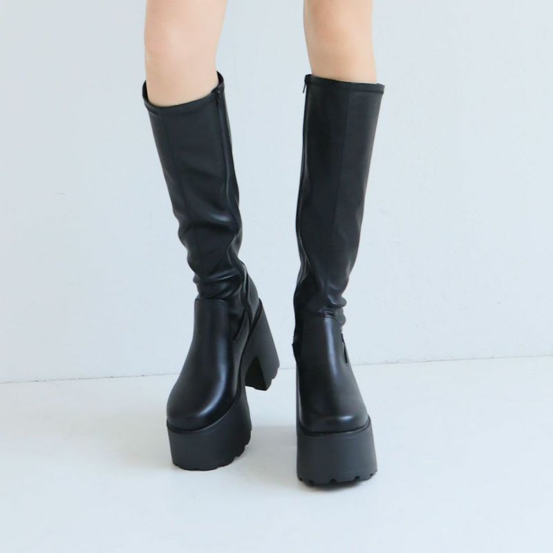 ・圧倒的な存在感を放つ11cmチャンキーヒールと、脚にフィットする美シルエットで足元も盛れるストレッチロングブーツ!