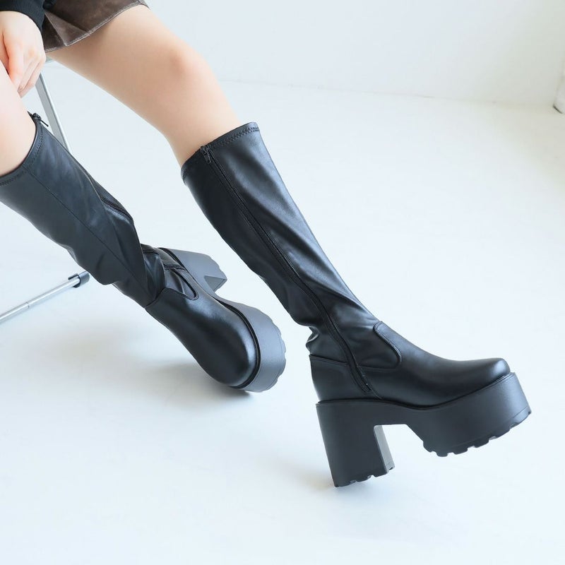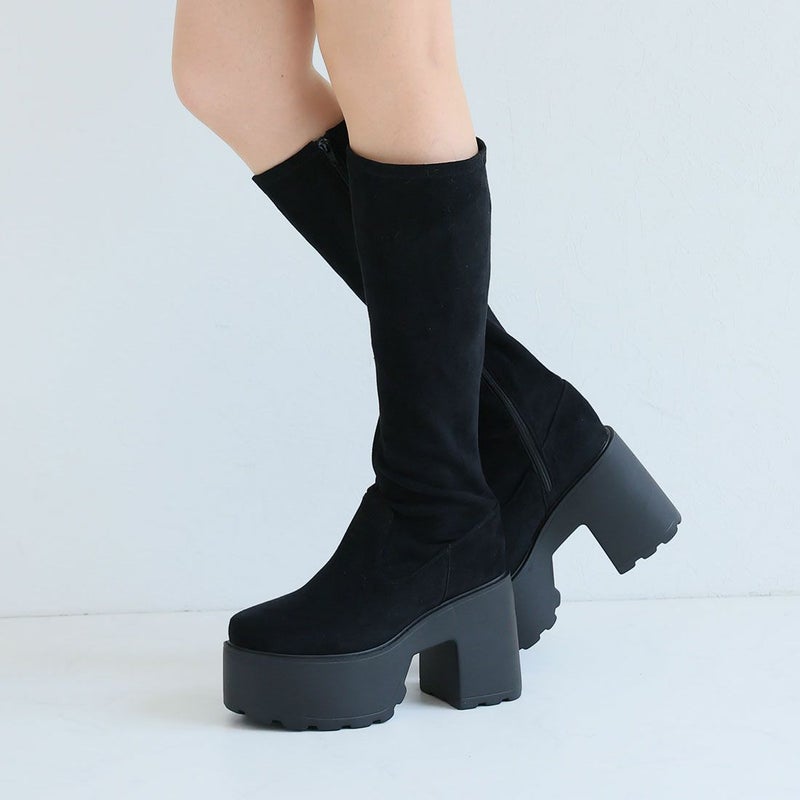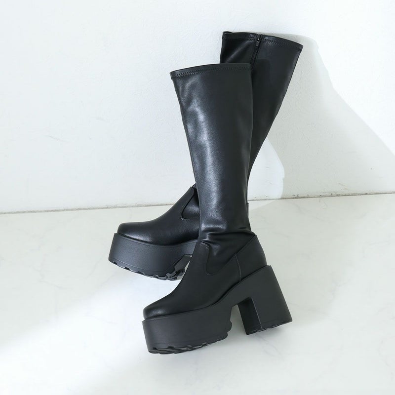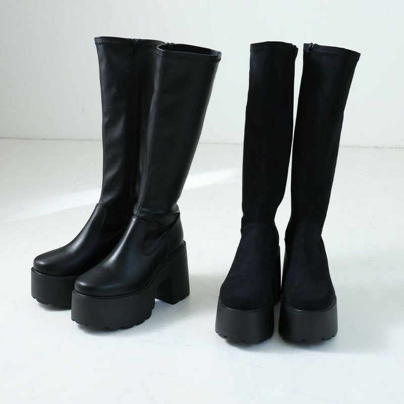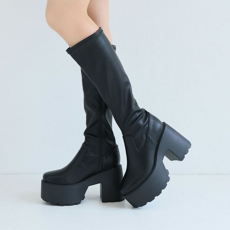 ・圧倒的な存在感を放つ11cmチャンキーヒールと、脚にフィットする美シルエットで足元も盛れるストレッチロングブーツ!