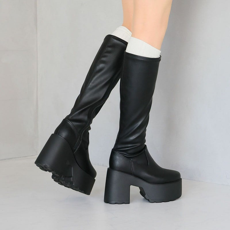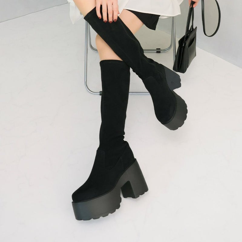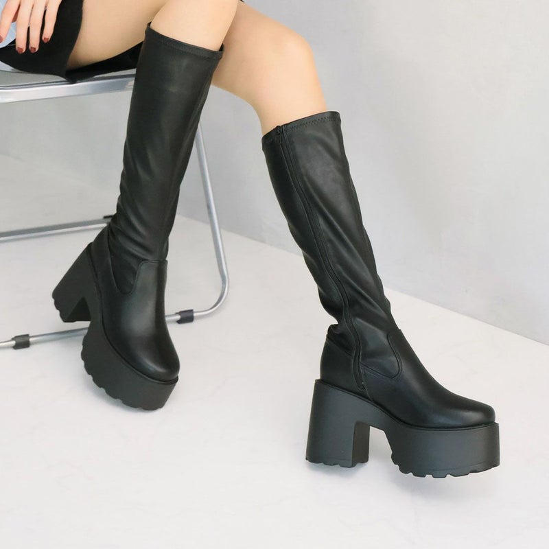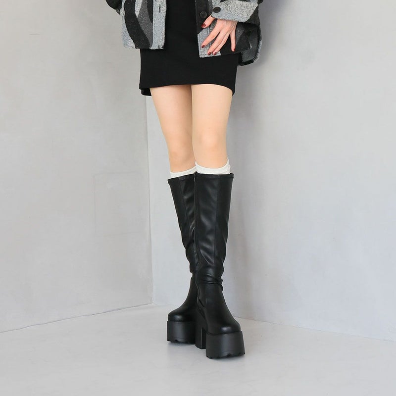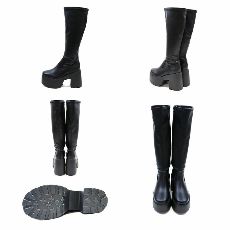 ・圧倒的な存在感を放つ11cmチャンキーヒールと、脚にフィットする美シルエットで足元も盛れるストレッチロングブーツ!