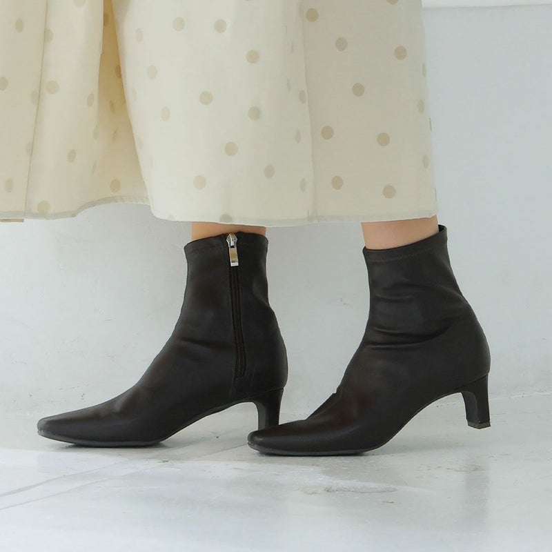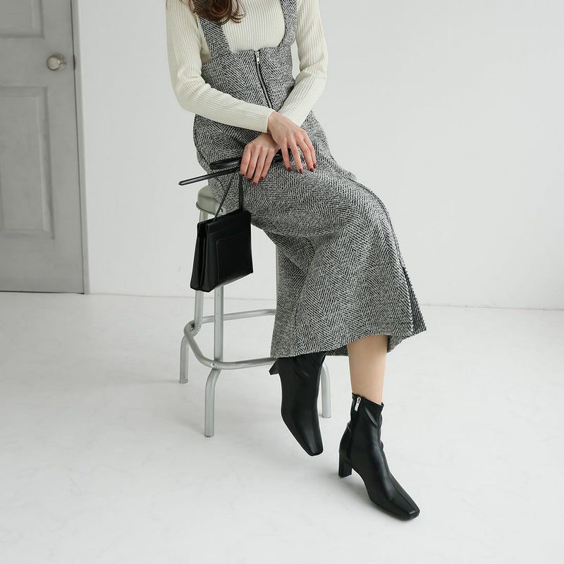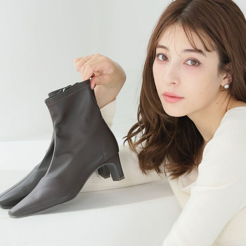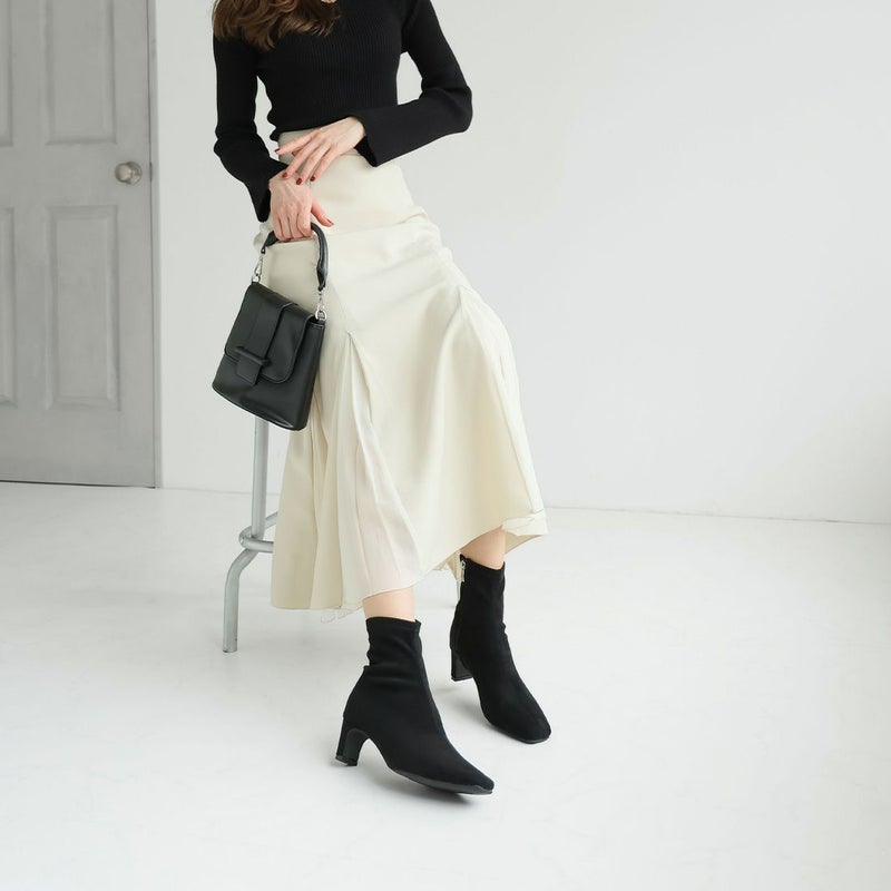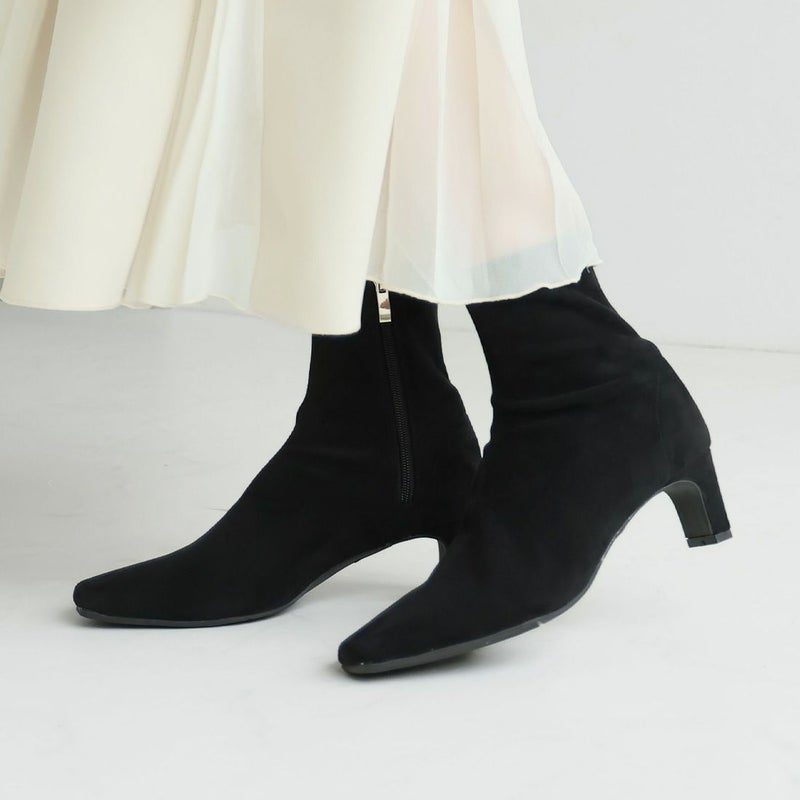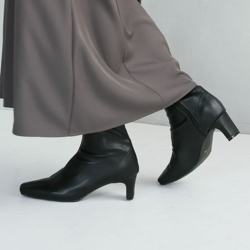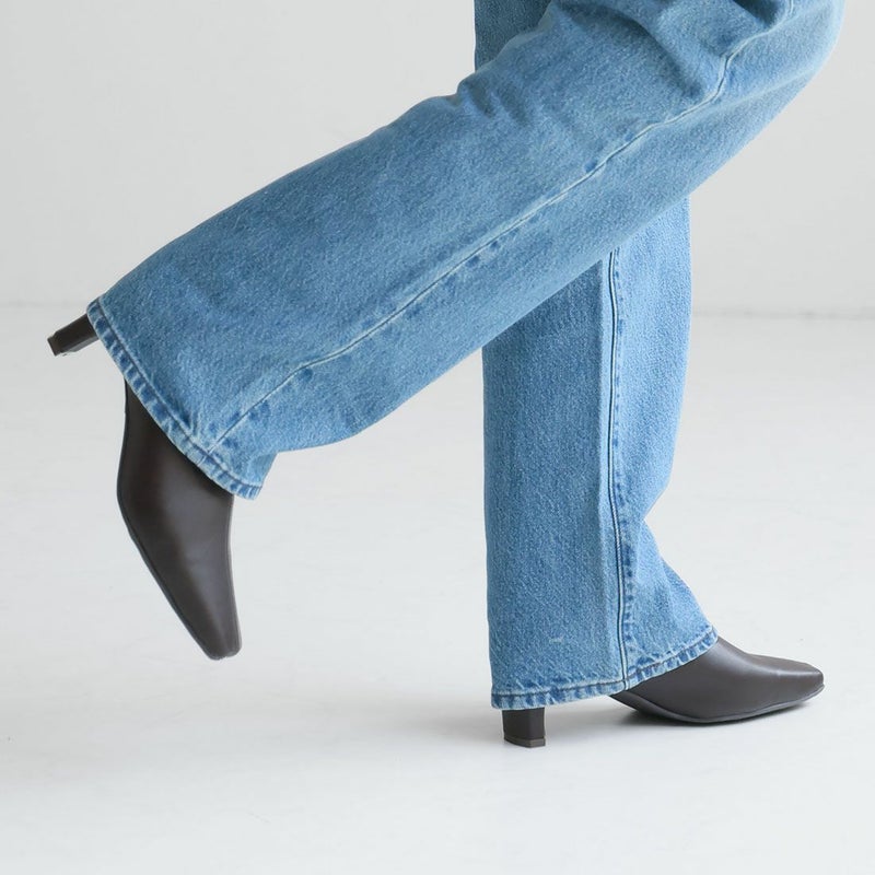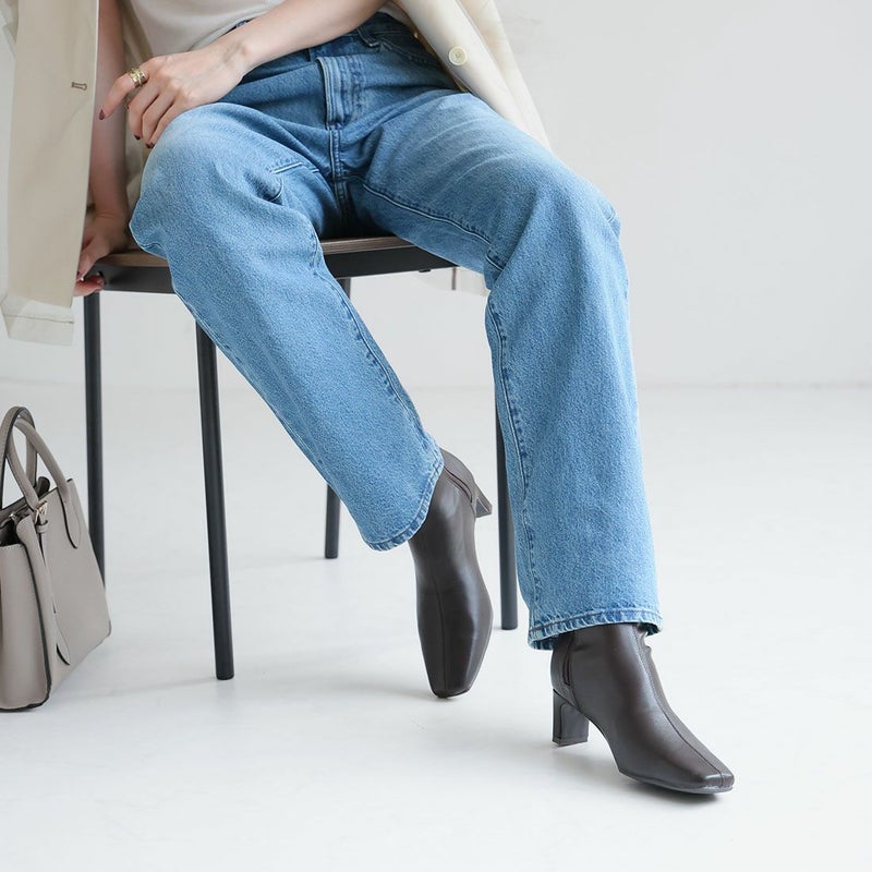 ・細めのスクエアトゥ×プレートヒールで脚をスッキリと見せてシャープさのある大人な美シルエットに。