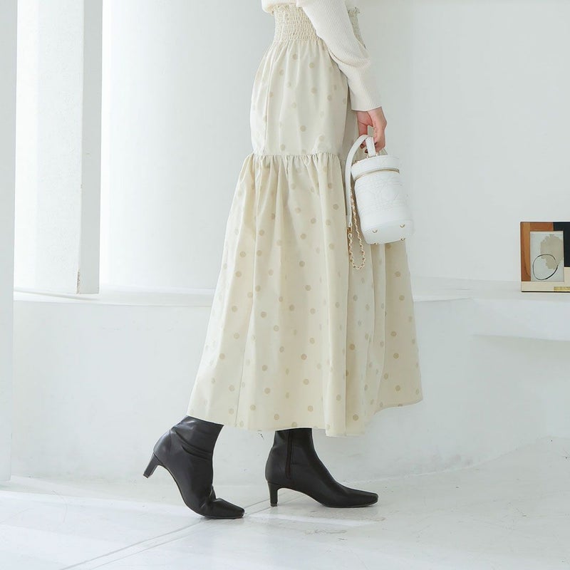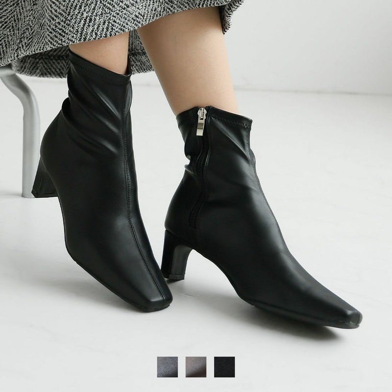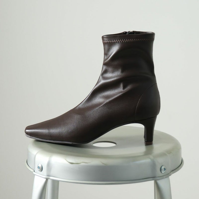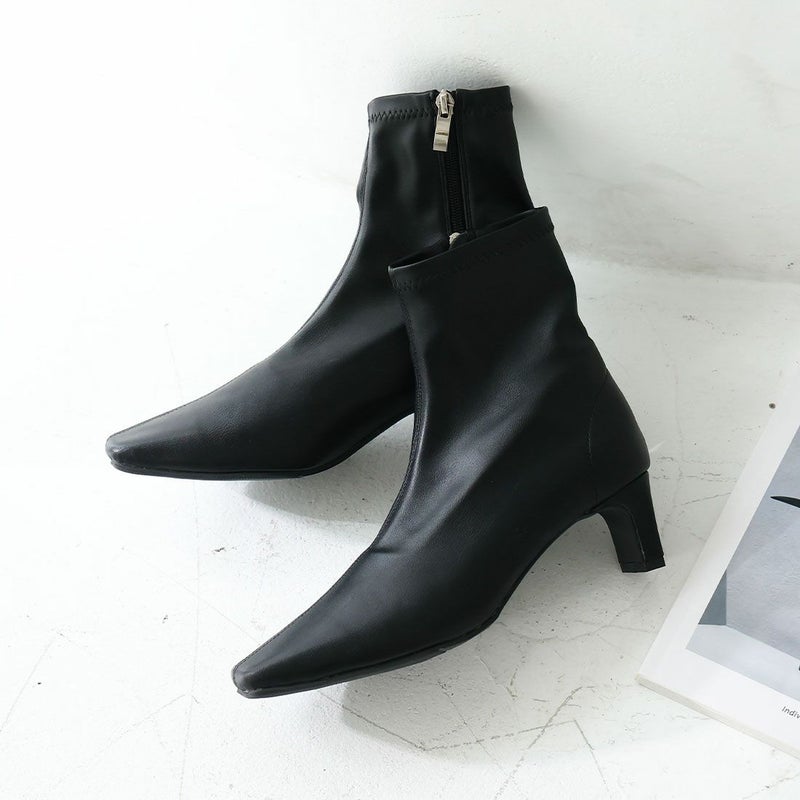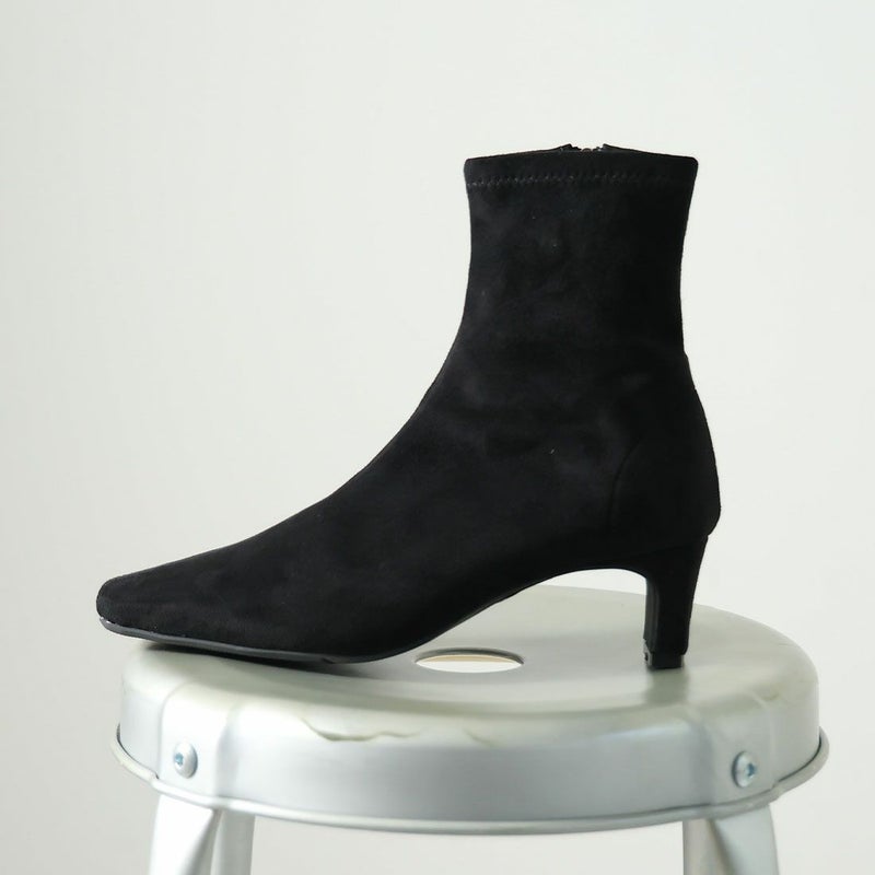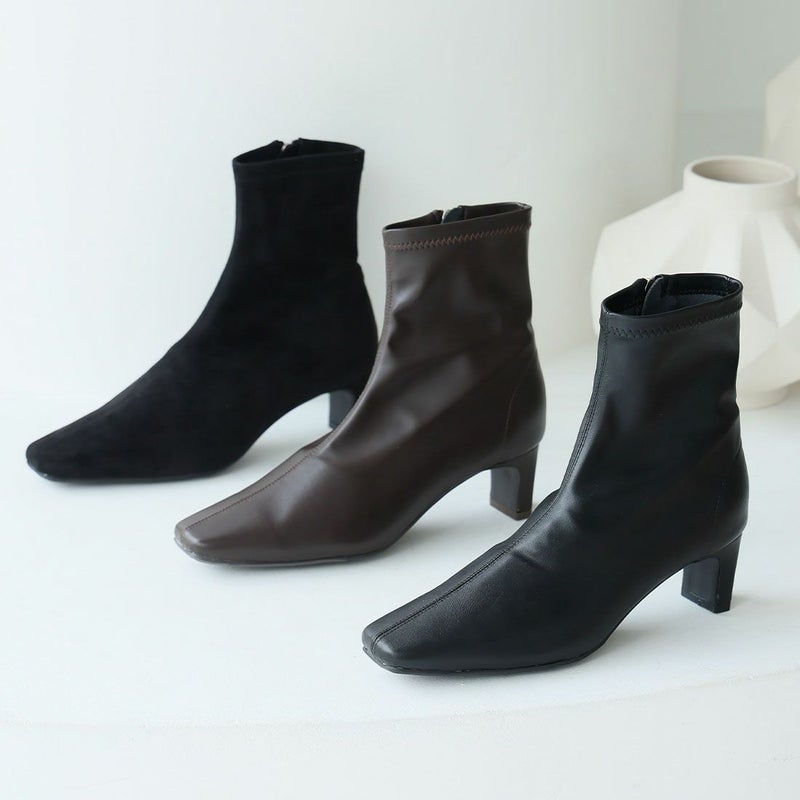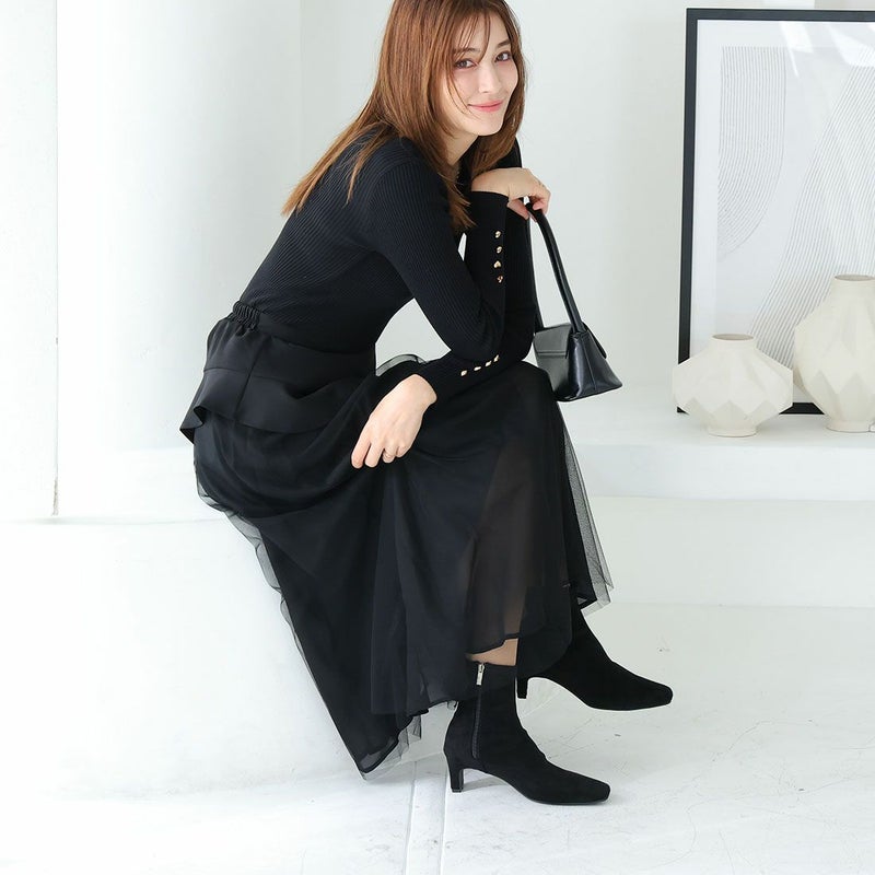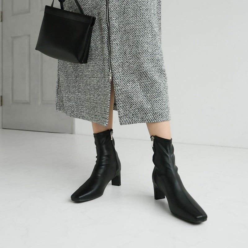 ・細めのスクエアトゥ×プレートヒールで脚をスッキリと見せてシャープさのある大人な美シルエットに。