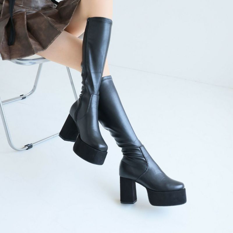 アッパーのレザーライクなストレッチ素材×厚底プラットフォーム&ヒールのスエード素材コンビで高級感をプラス。