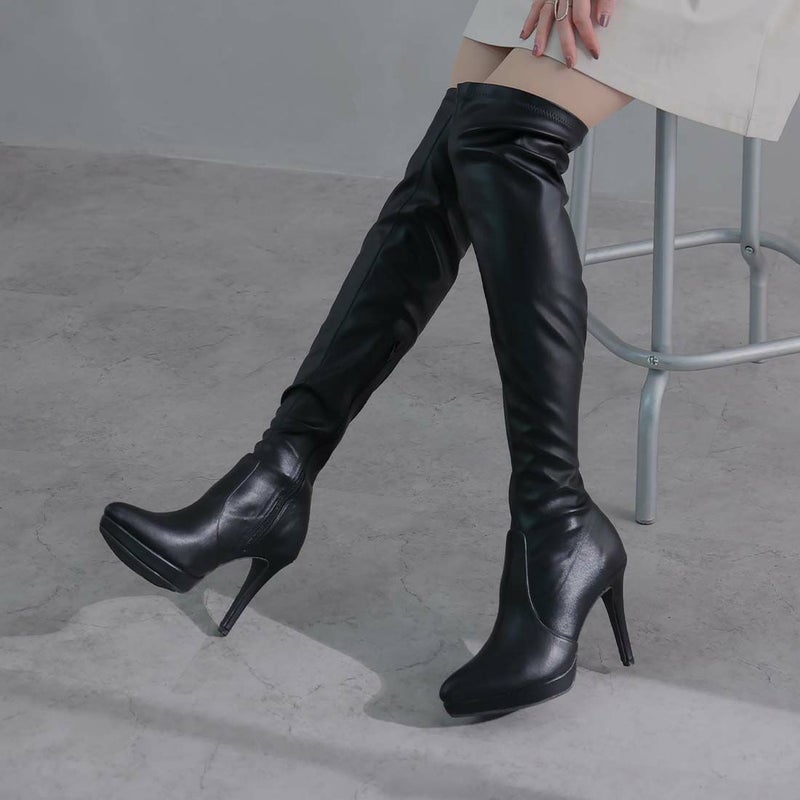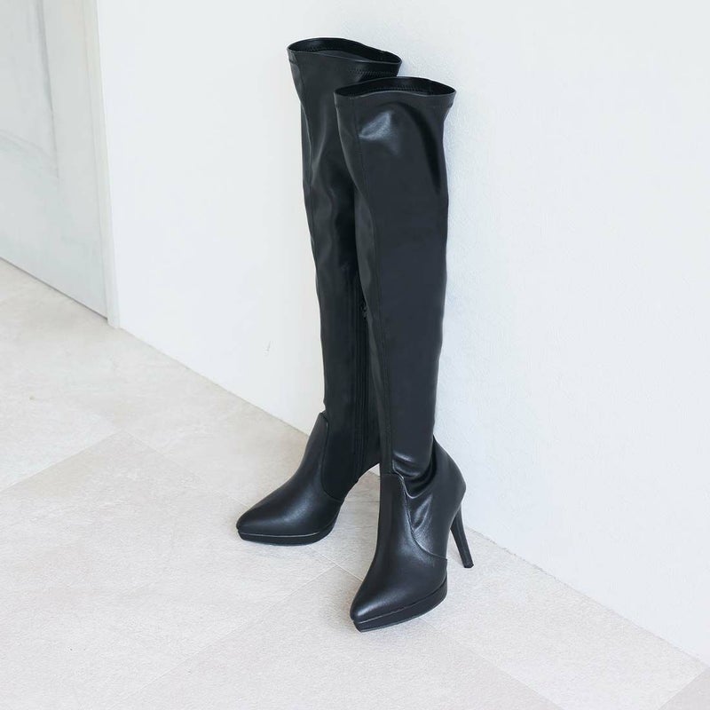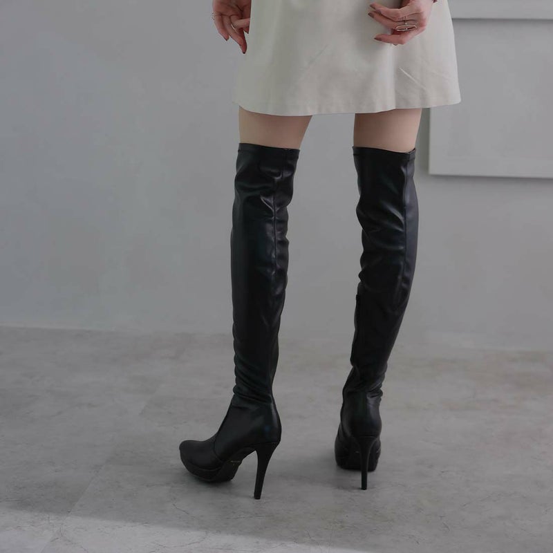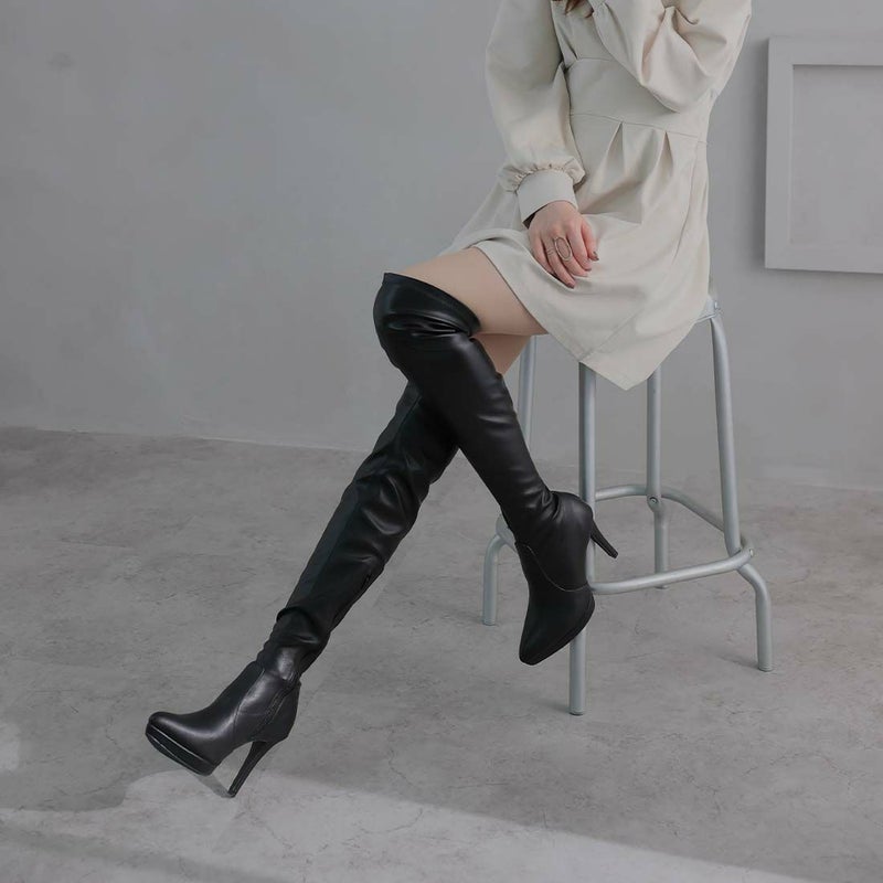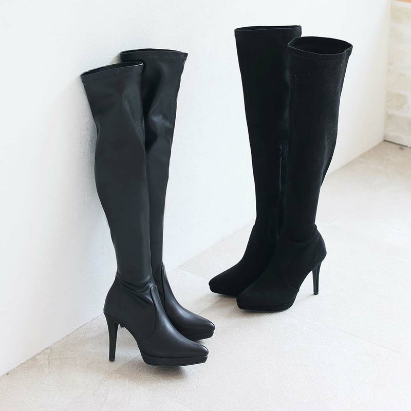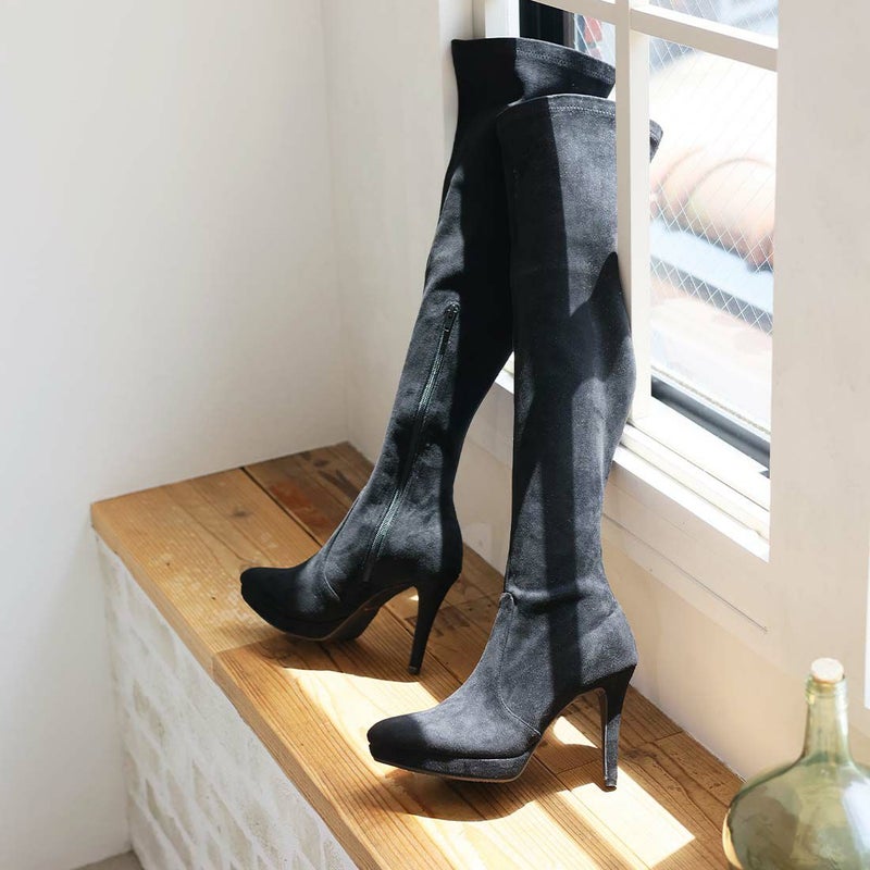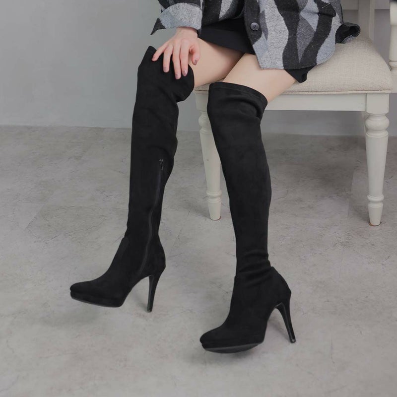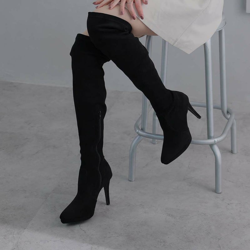 ・ポインテッドトゥ×ピンヒールでスタイルアップが叶うニーハイストレッチブーツ!
