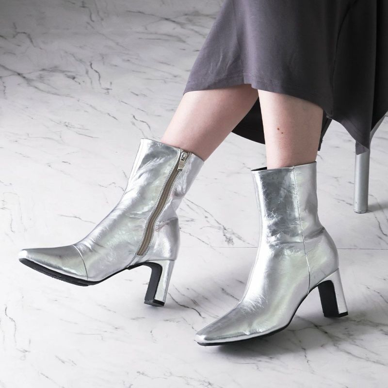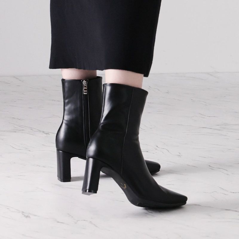 ・スクエアトゥ×プレートヒールでシャープさのある大人な美脚シルエットに。