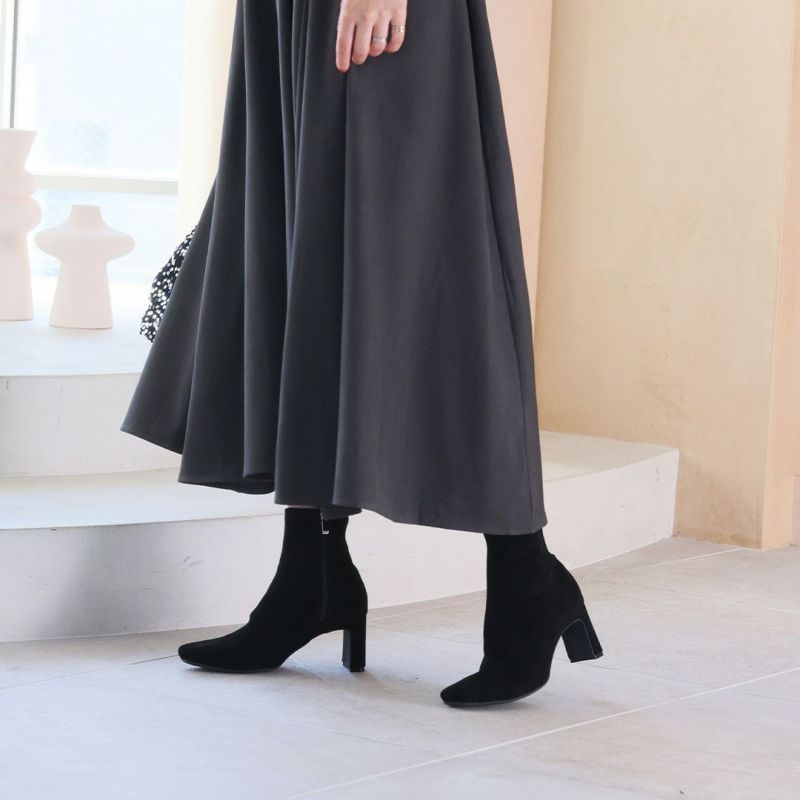・細めのスクエアトゥ×プレートヒールで脚をスッキリと見せてシャープさのある大人な美シルエットに。