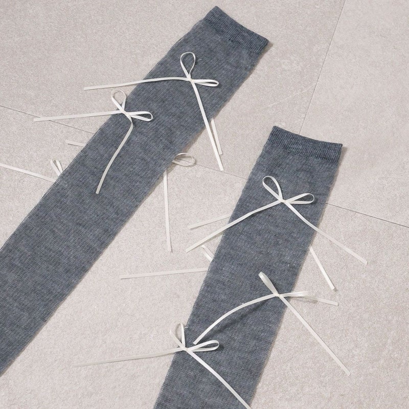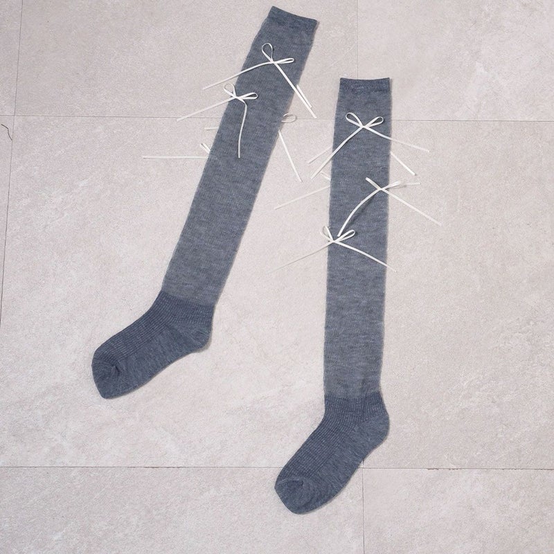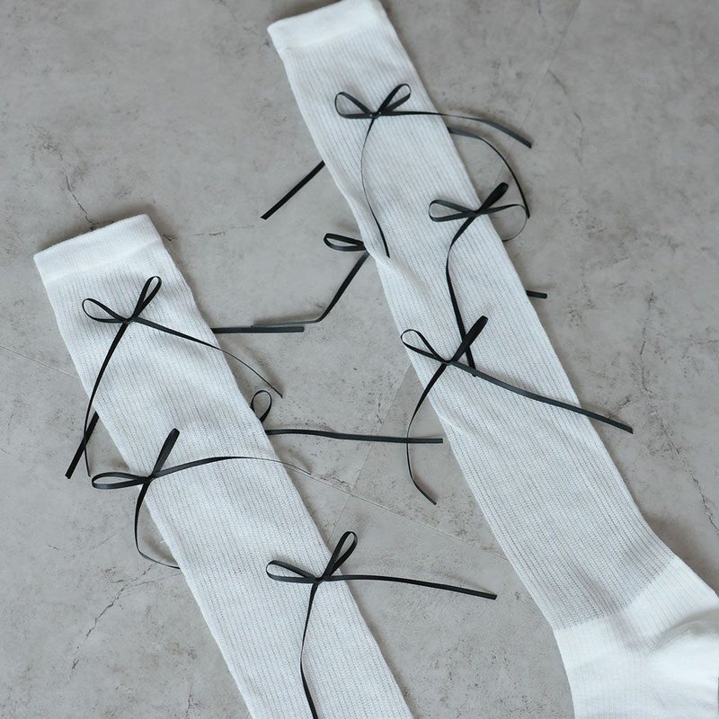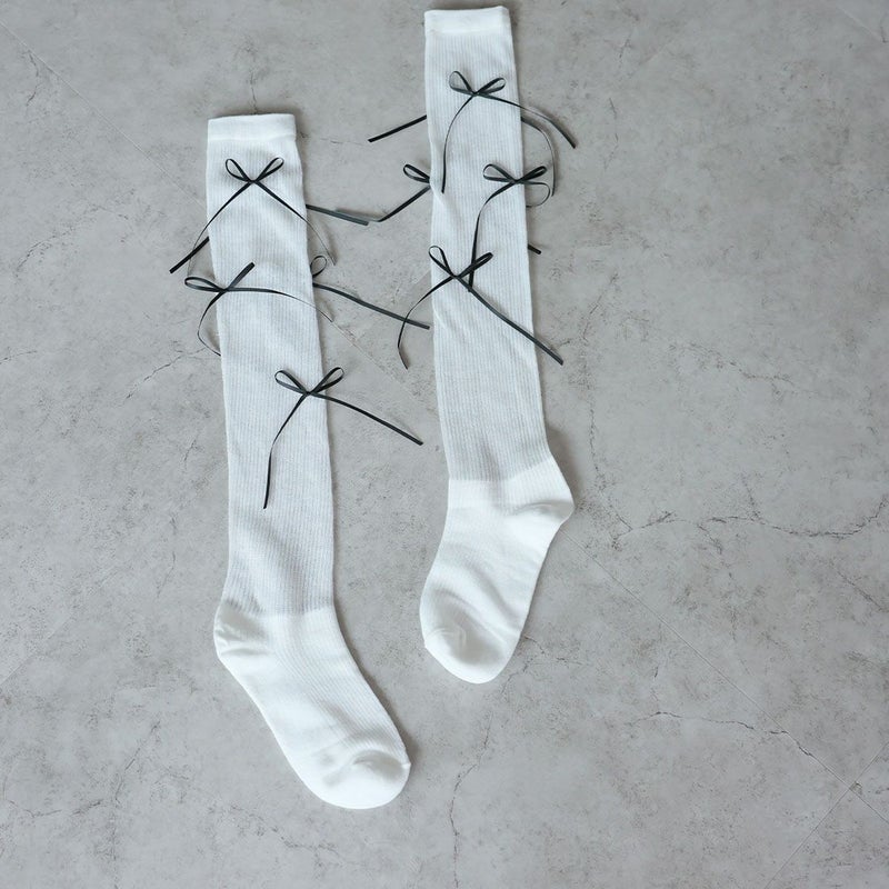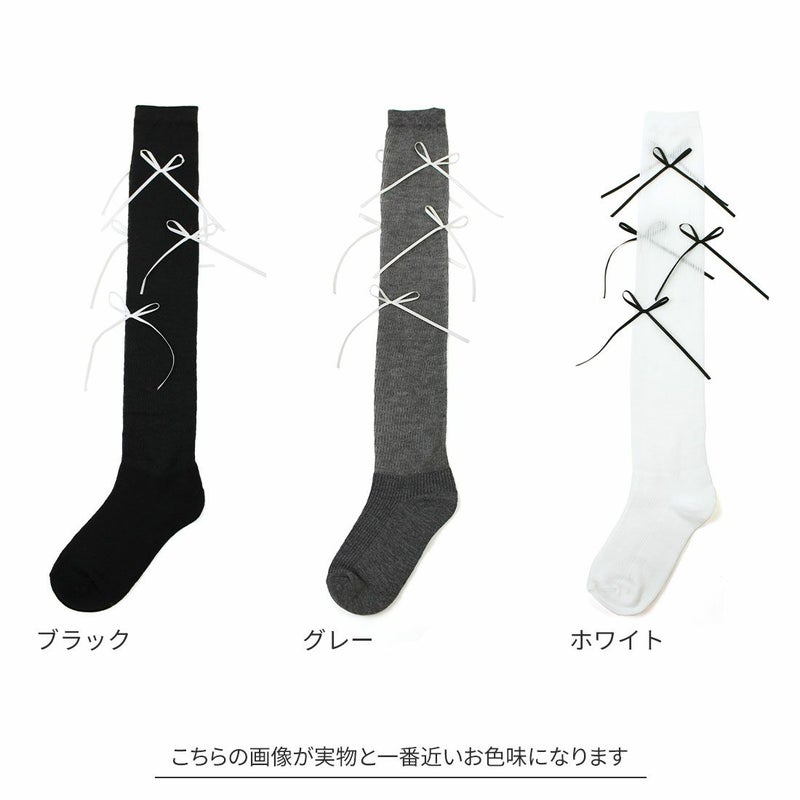 ・韓国トレンドの長めなサテンリボンがポイントのハイソックス!