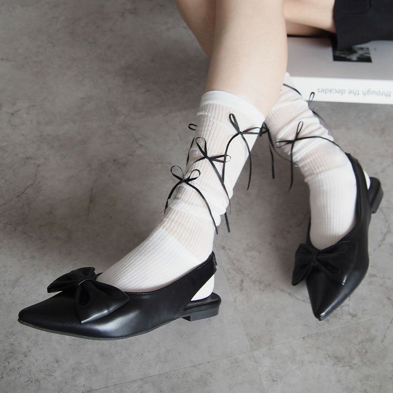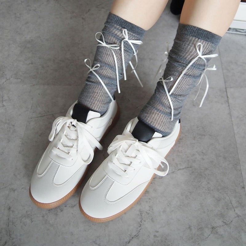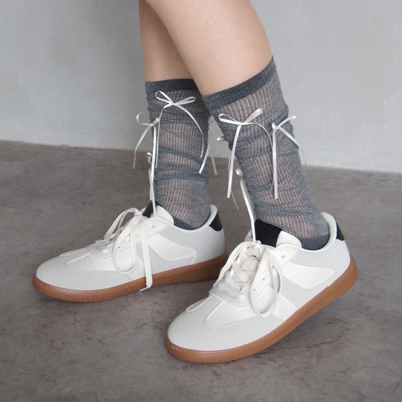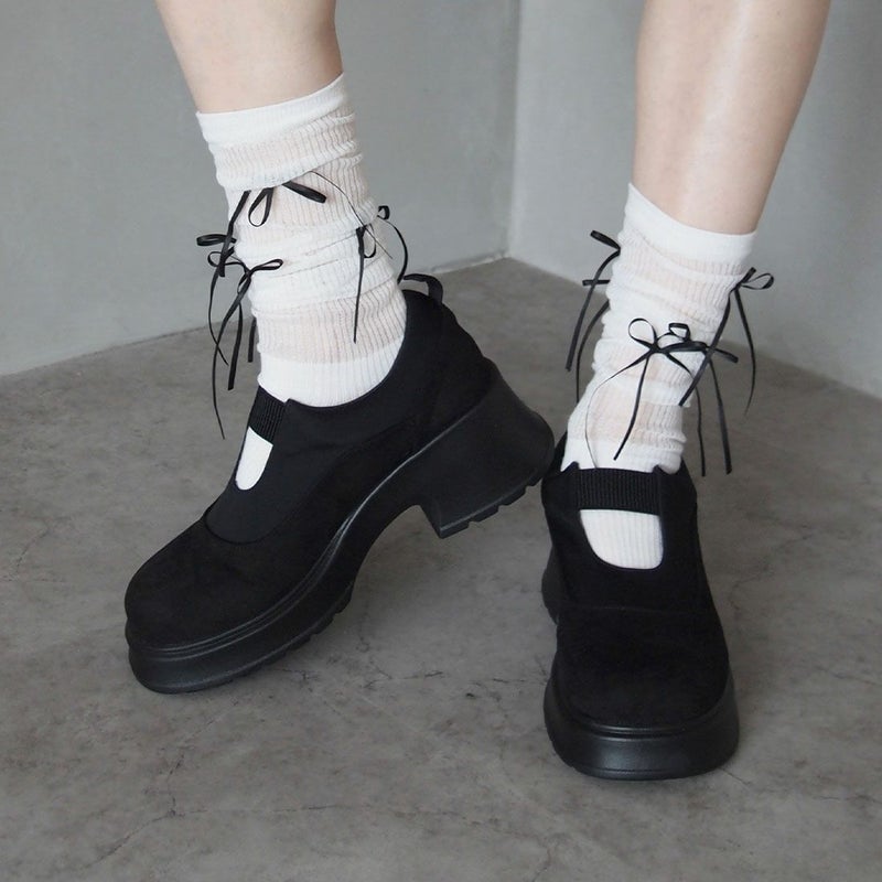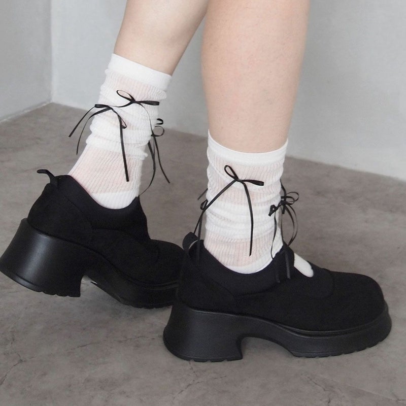 ・韓国トレンドの長めなサテンリボンがポイントのハイソックス!