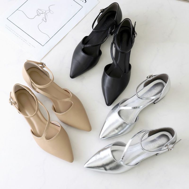 ・斜めストラップとセパレートデザインでレディライクな足元を演出
