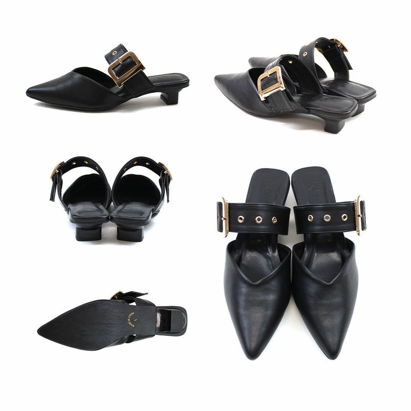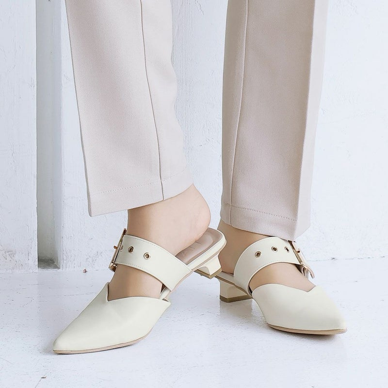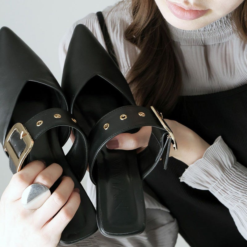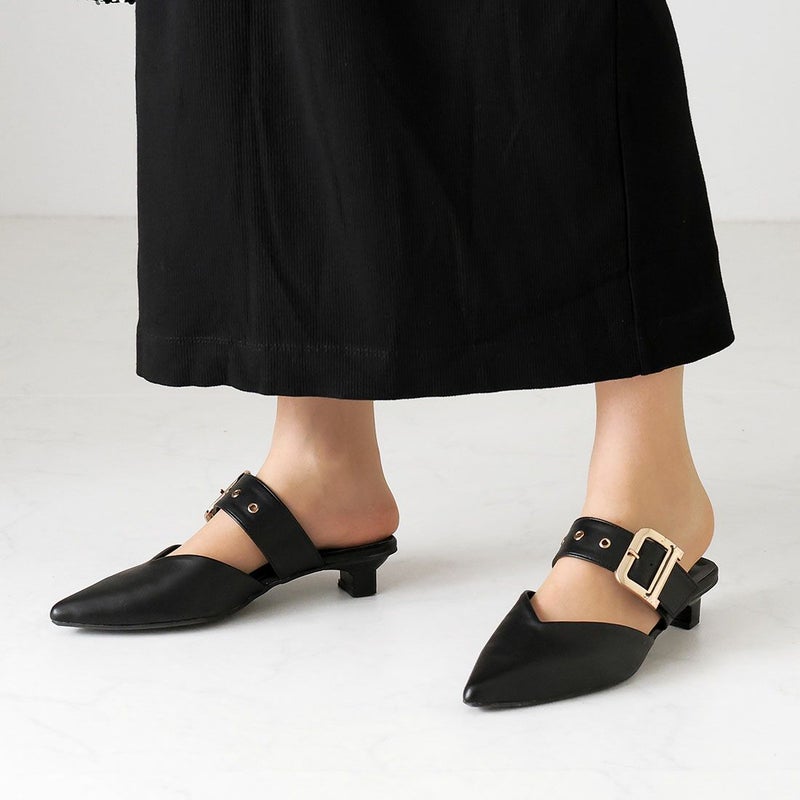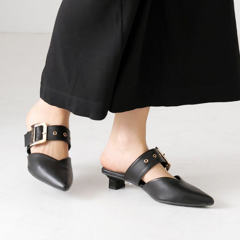 ・ゴールドバックルの太ベルトがアクセントのエレガントなミュールパンプス
