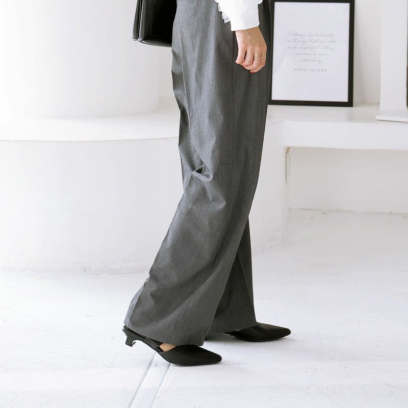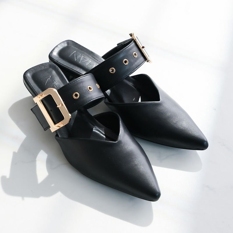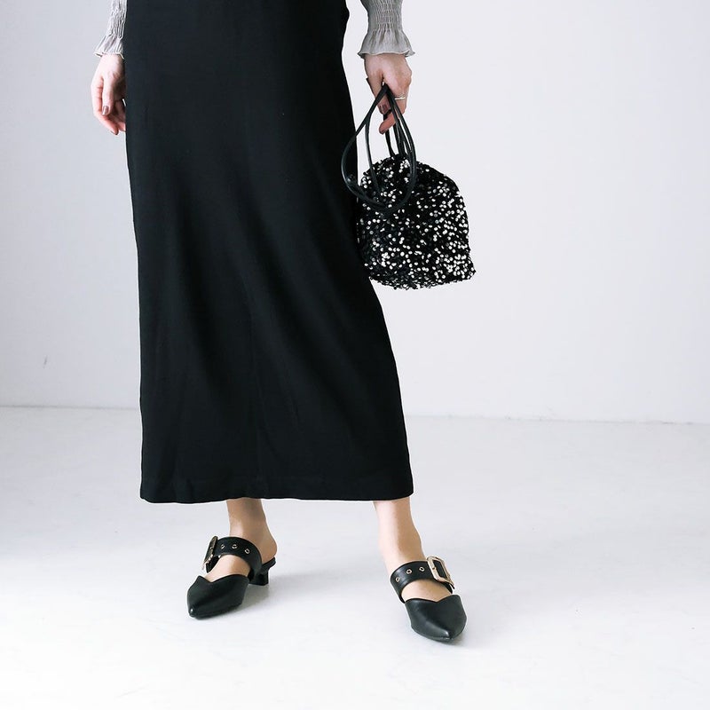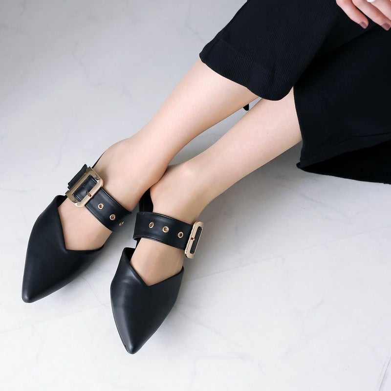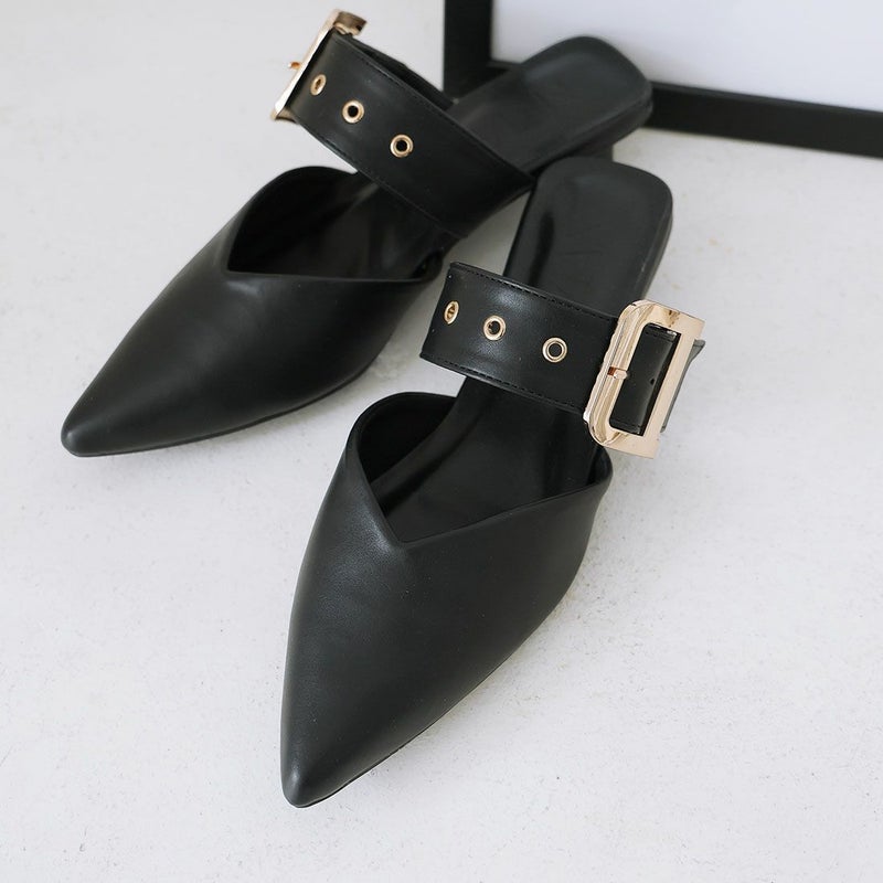 ・ゴールドバックルの太ベルトがアクセントのエレガントなミュールパンプス