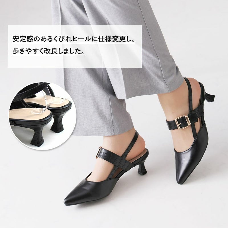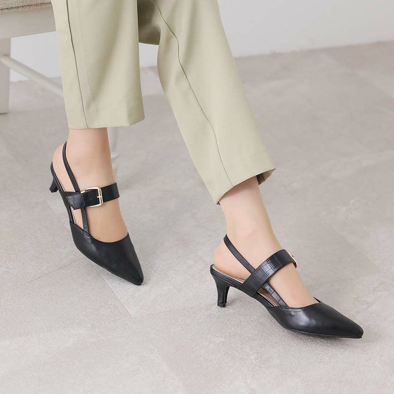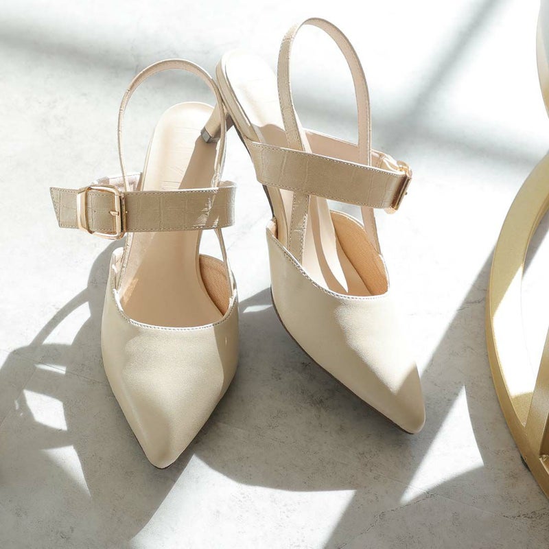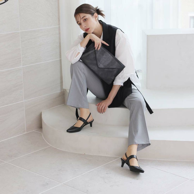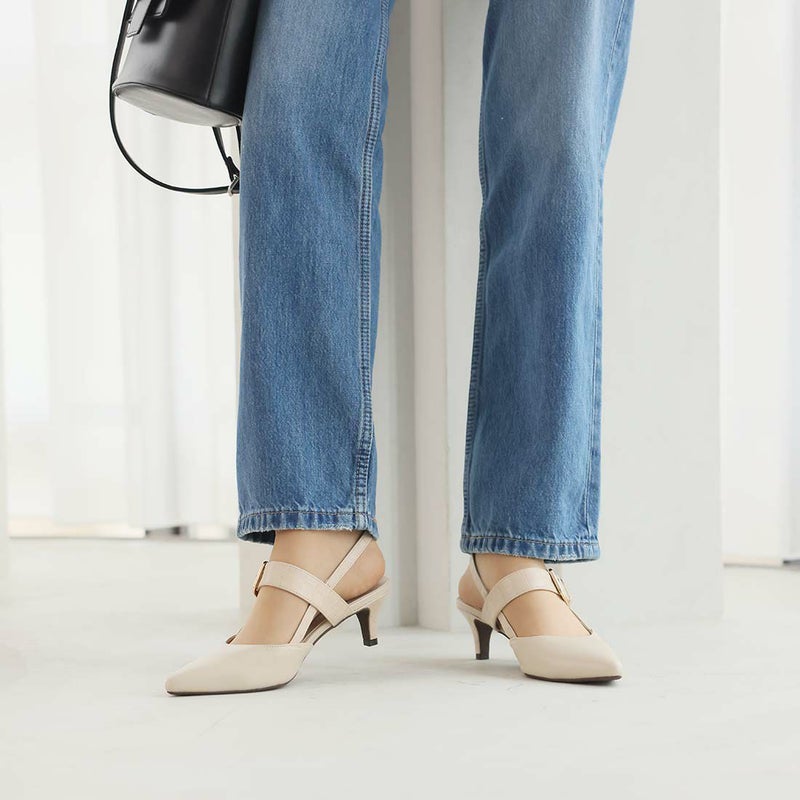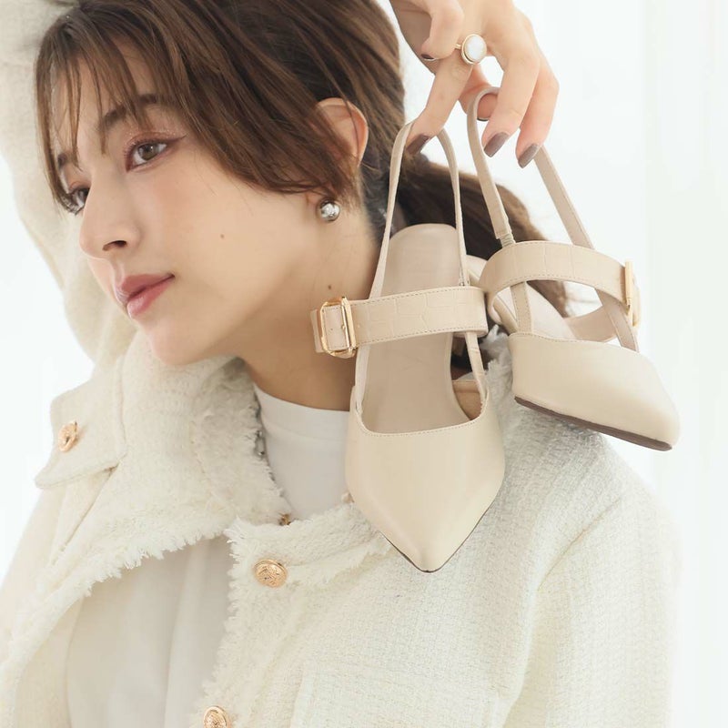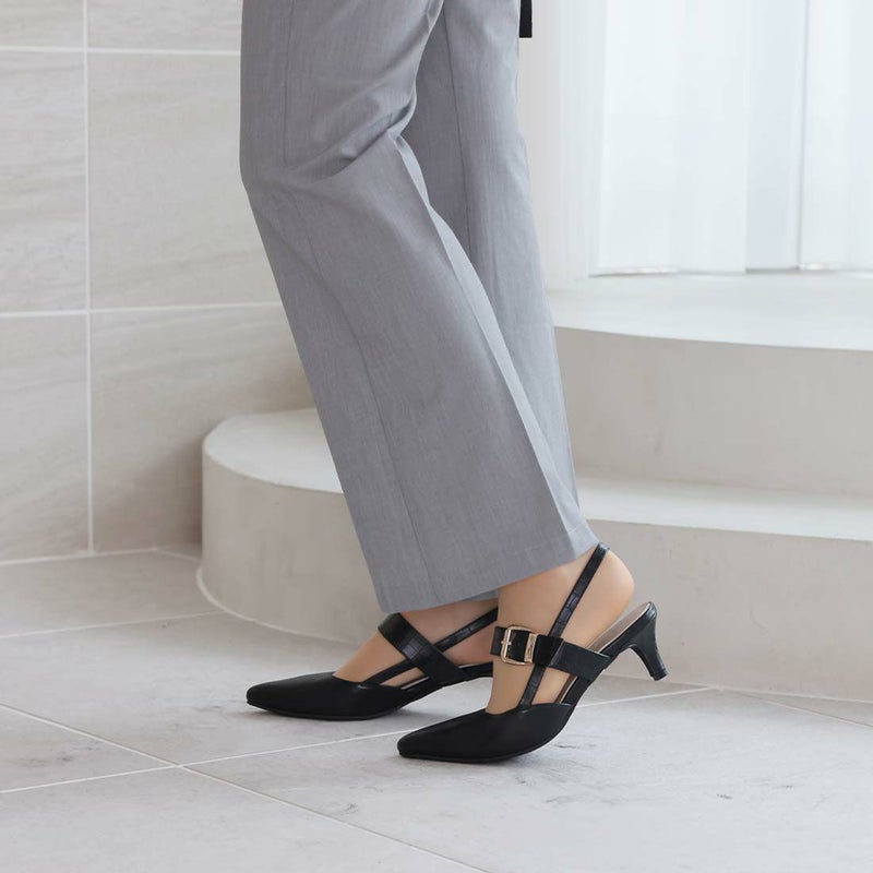 ・ポインテッドトゥ×バックストラップの組み合わせはお仕事コーデにも◎。