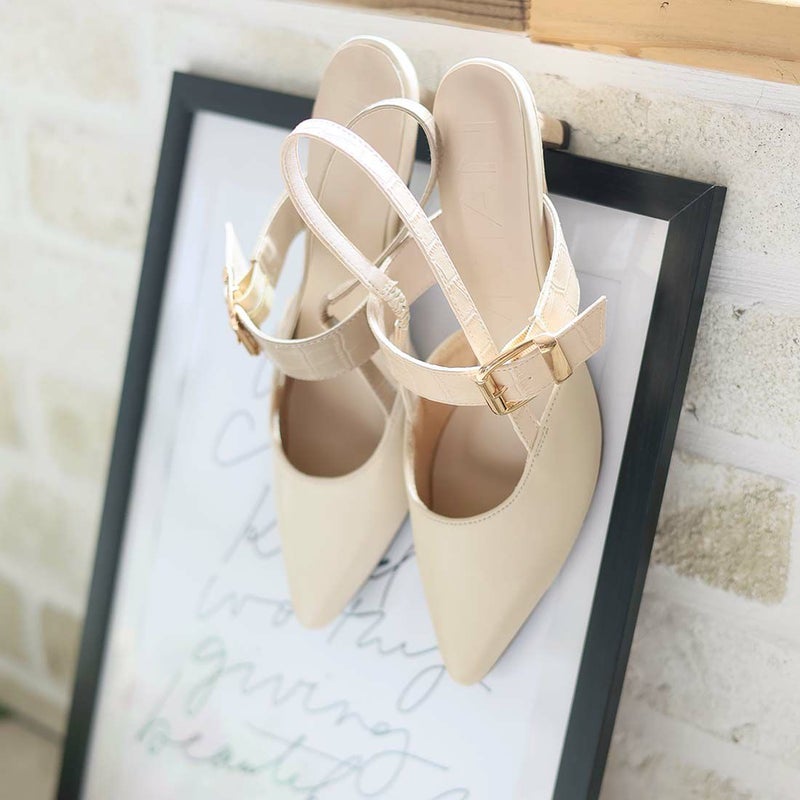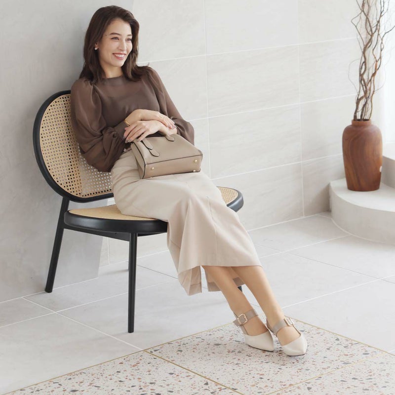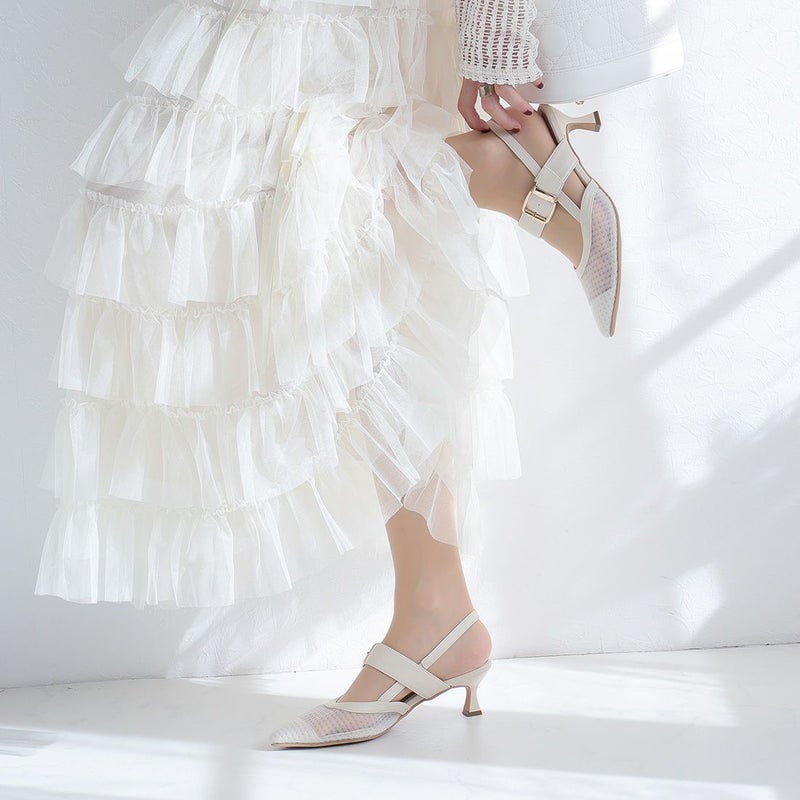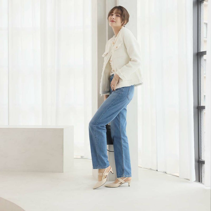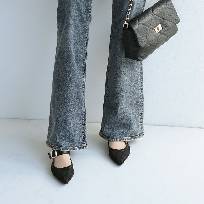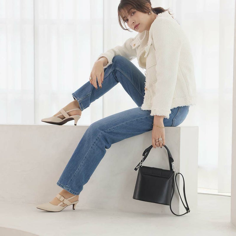・ポインテッドトゥ×バックストラップの組み合わせはお仕事コーデにも◎。