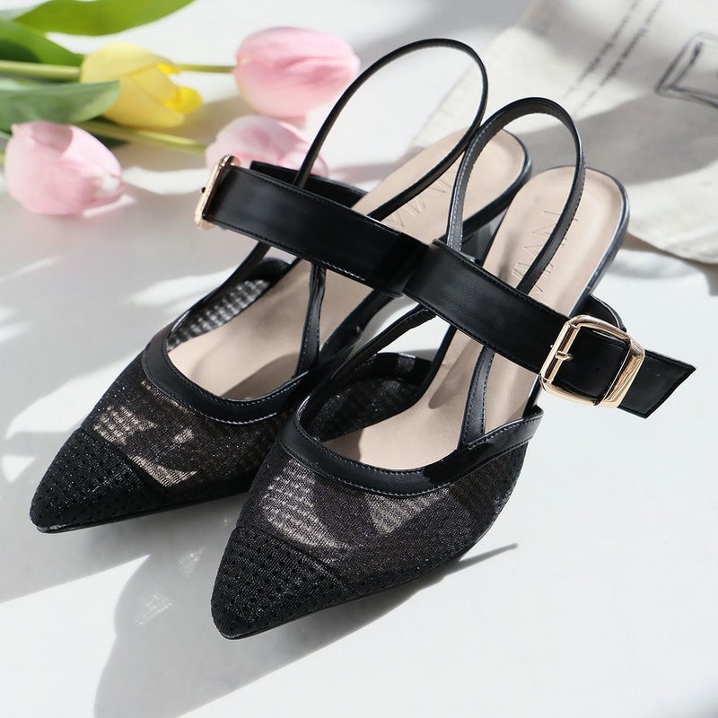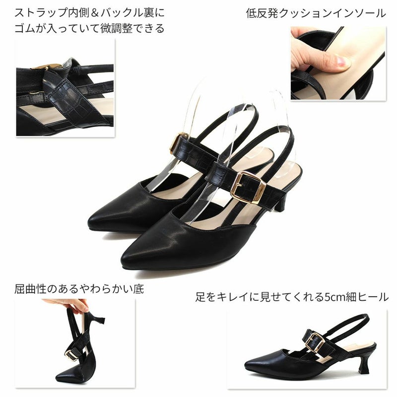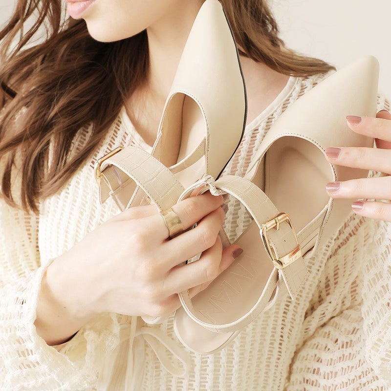 ・太ベルト×華奢バックストラップの対照的な組み合わせがモードでエレガントなパンプス。