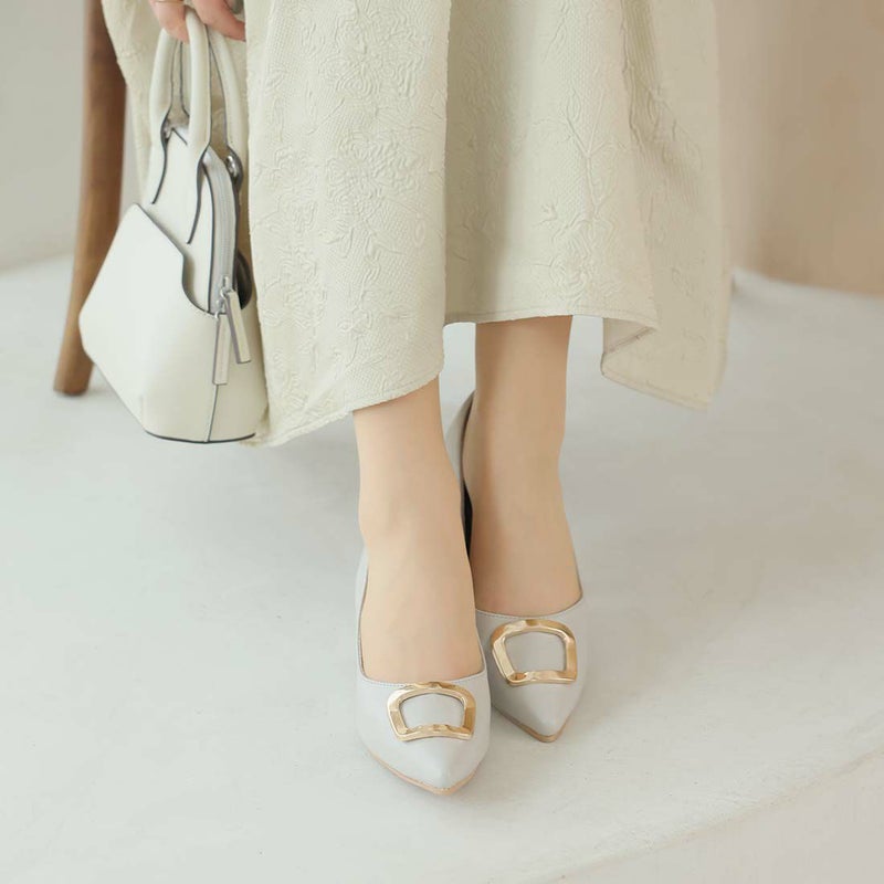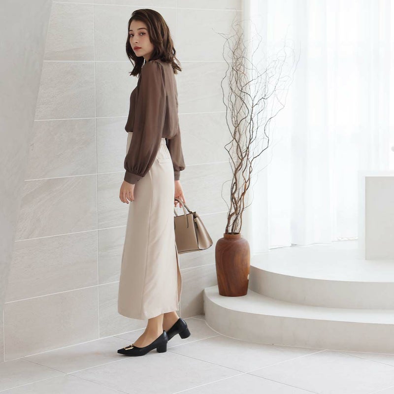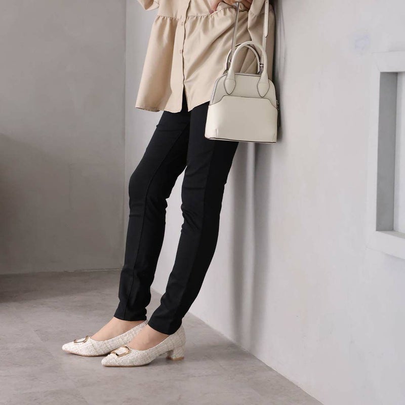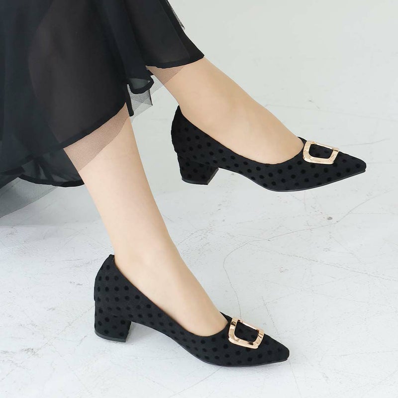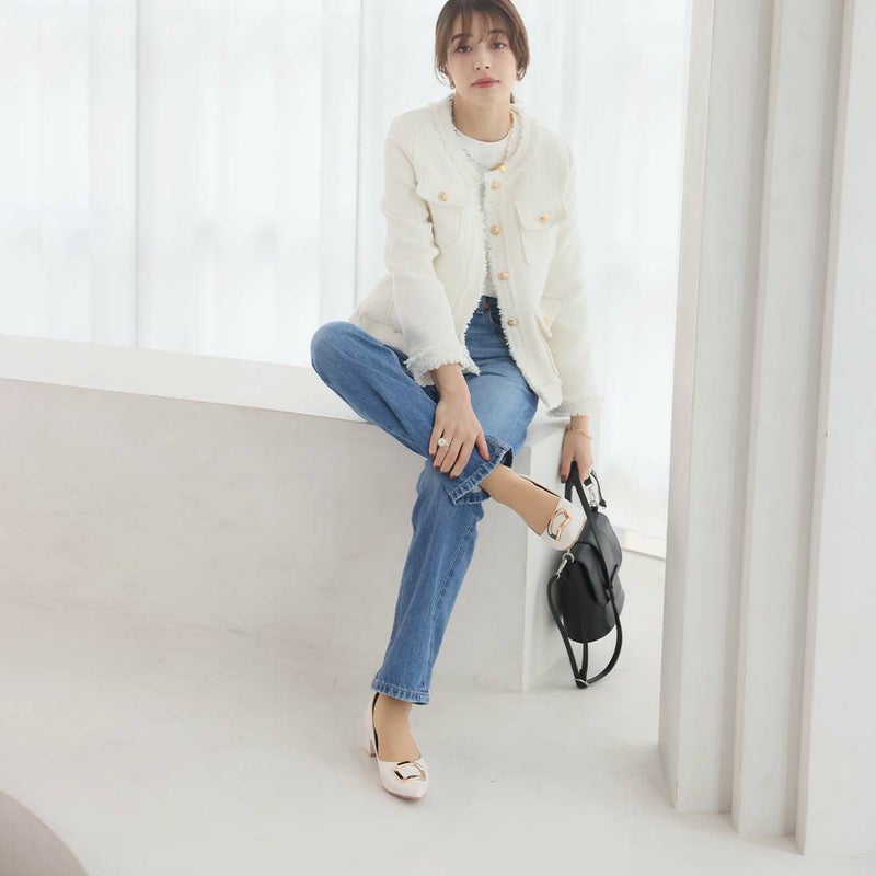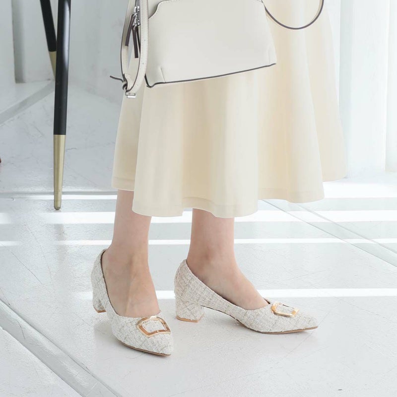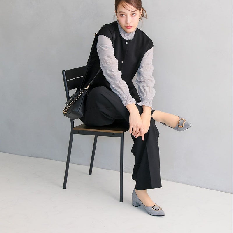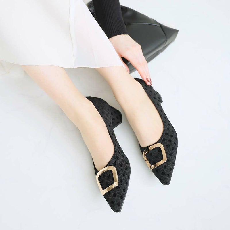 ・ポインテッドトゥ×ブロックヒールで甘くなりすぎない上品フォルム。