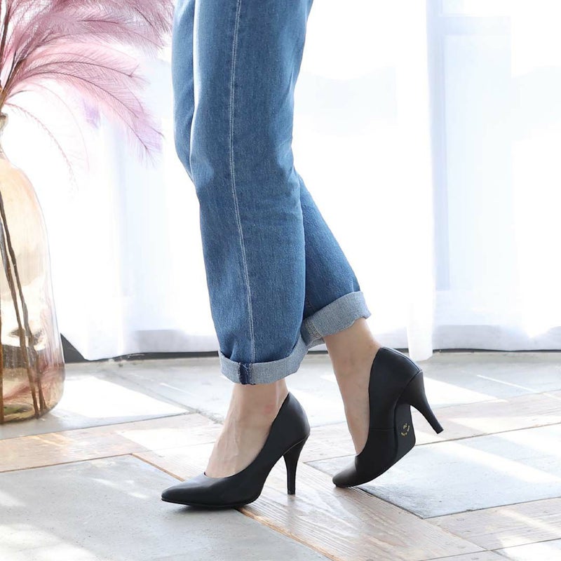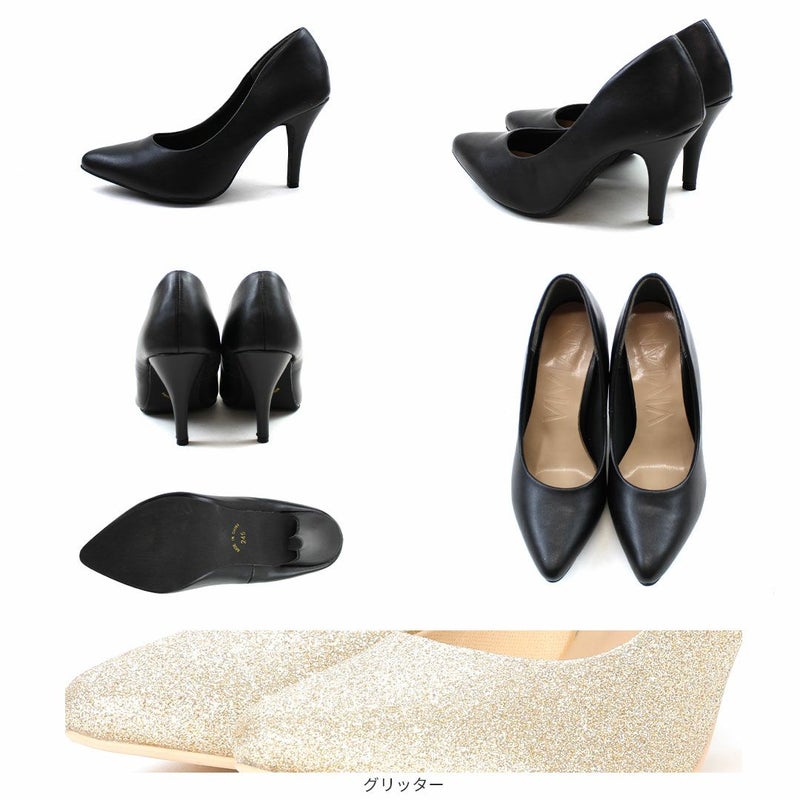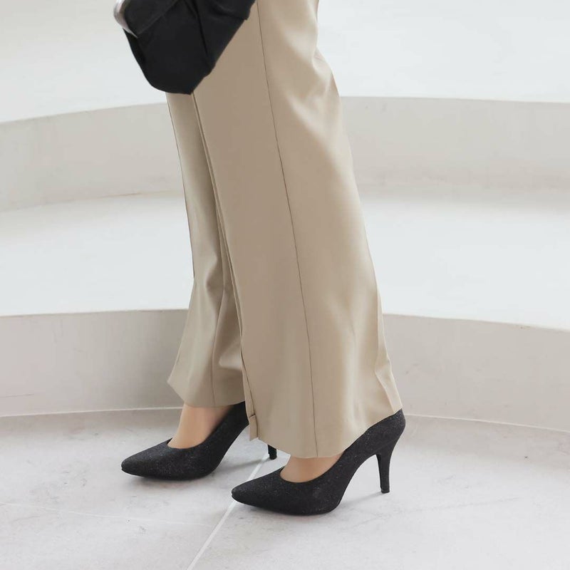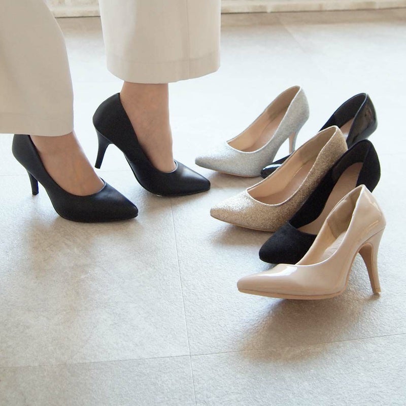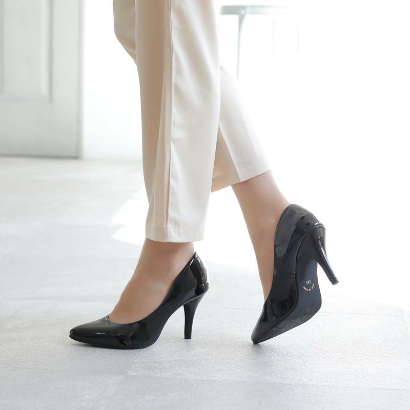 足をきれいに見せてくれる美脚効果バツグンの9cmヒールのポインテッドトゥパンプスは、