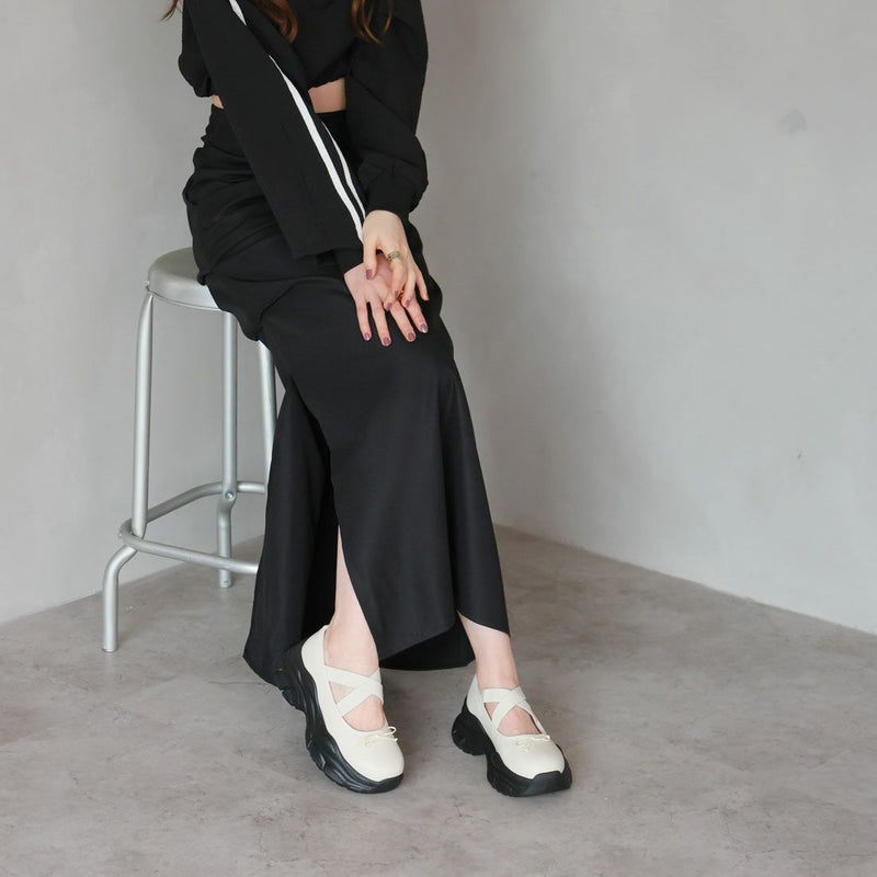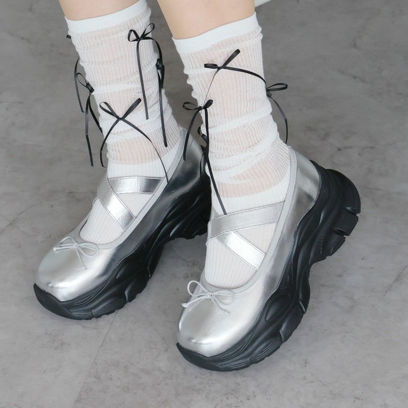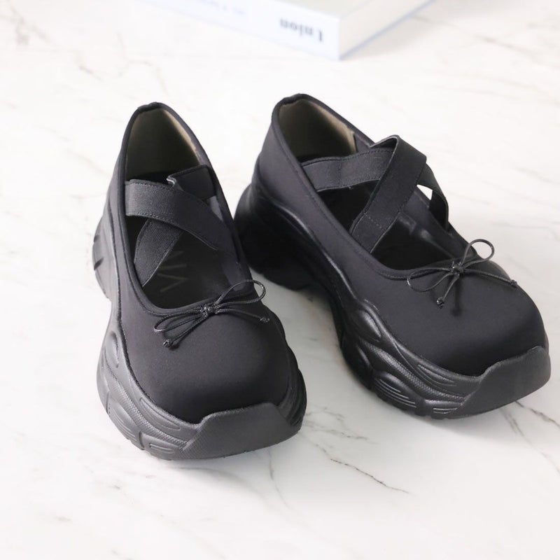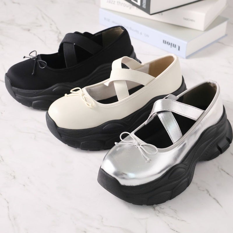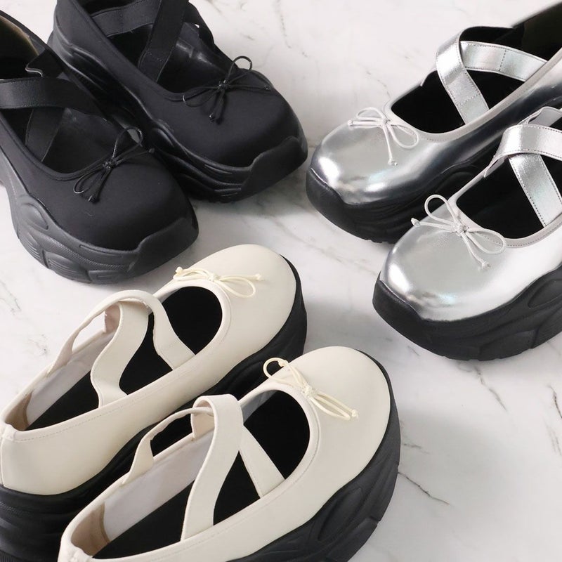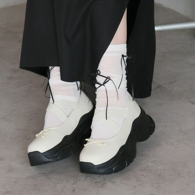 ・ぽってりとしたボリュームソールとクロスゴムがポイントの厚底バレエシューズスニーカー