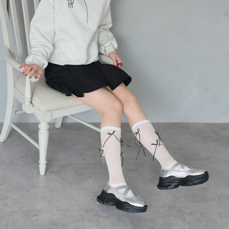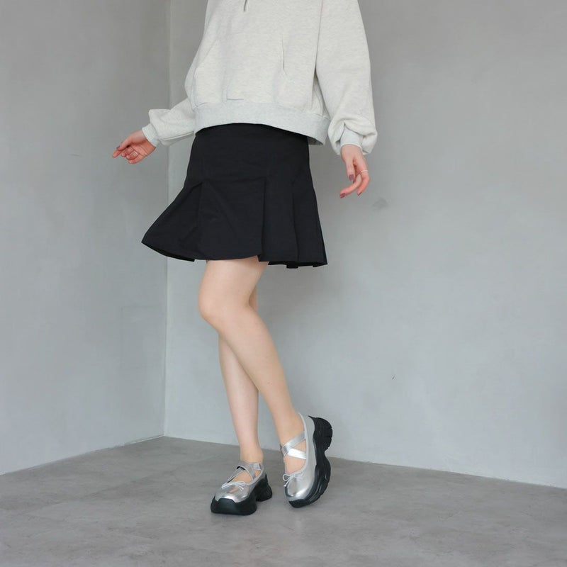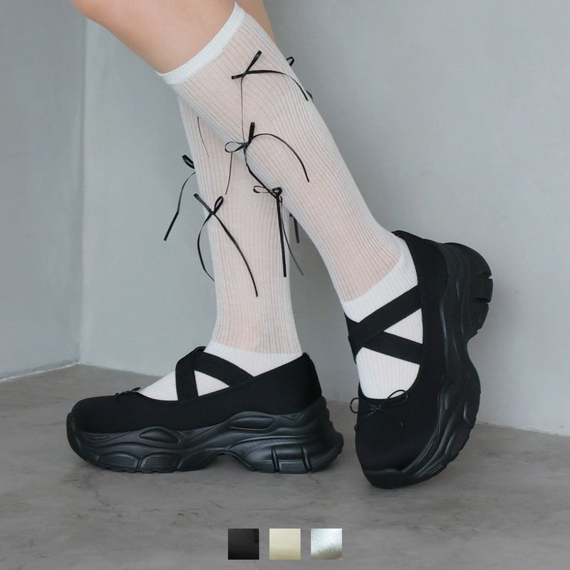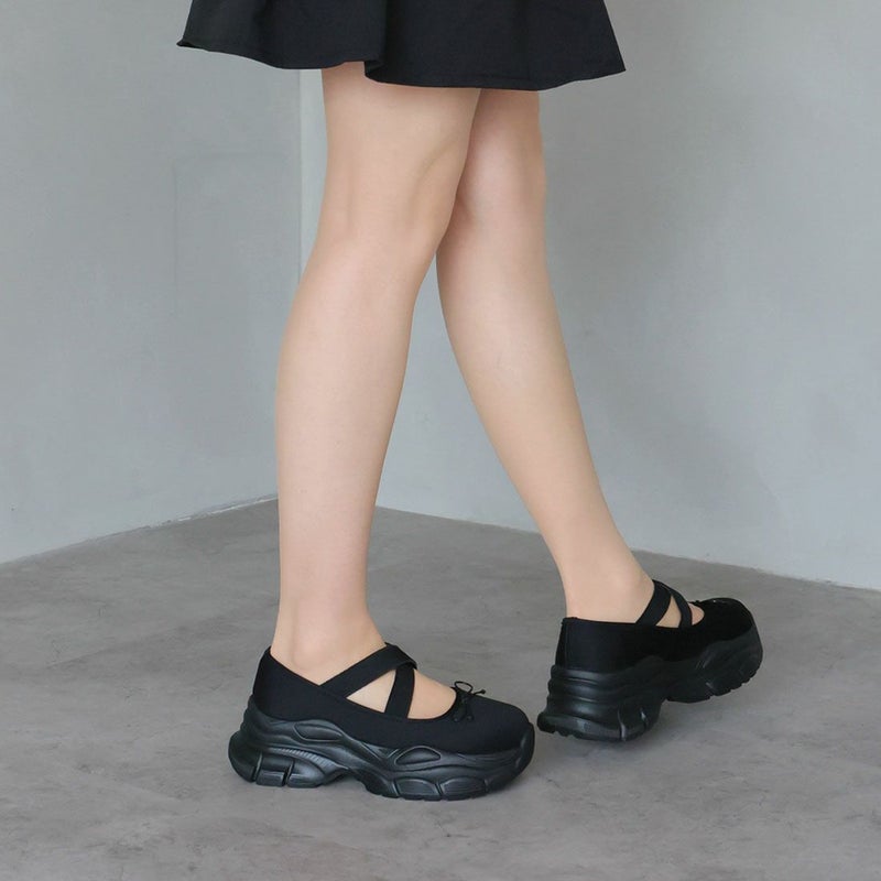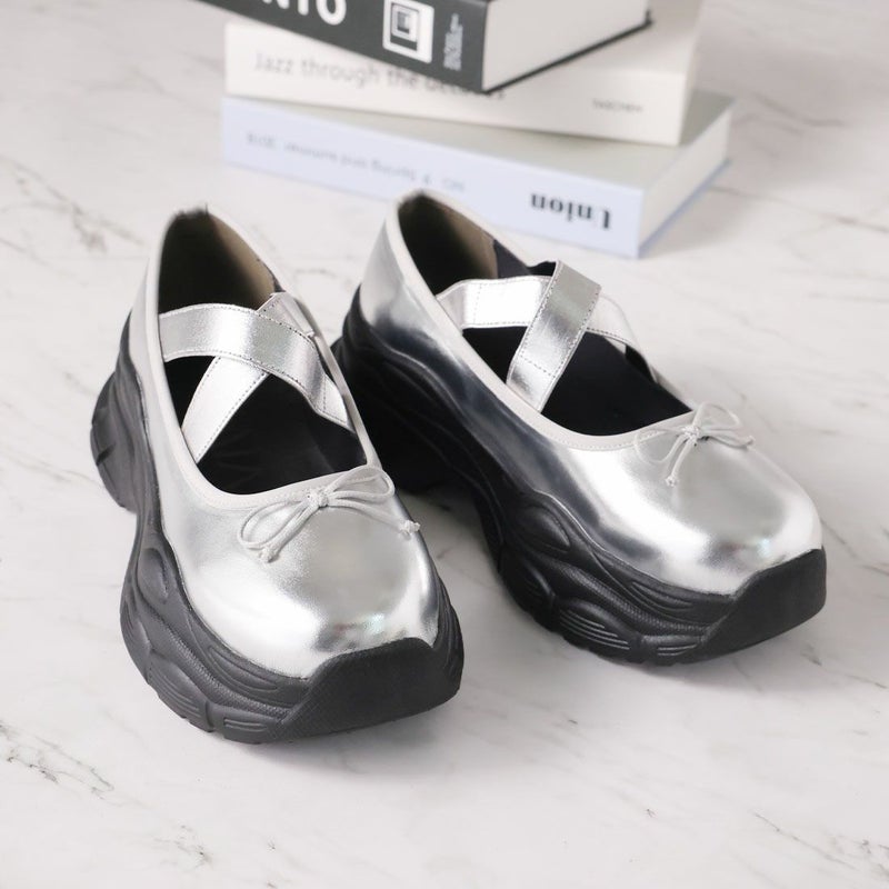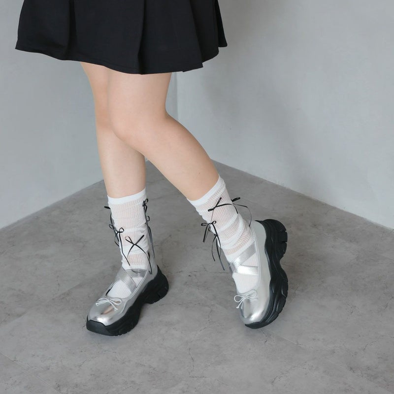 ・ぽってりとしたボリュームソールとクロスゴムがポイントの厚底バレエシューズスニーカー
